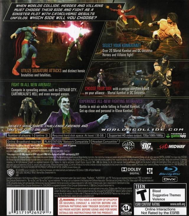 No hay nada mejor, que ver a estos 2 épicos universos combatir el uno contra el otro. Entre algunos de los participantes de Dc, se encuentran: Superman con su potente visión termal, Batman y su incomparable arsenal de aditamentos, la intrépida mujer maravilla e incluso el lunático Guason. Por otra parte, los kombatientes mortales son representados por el valeroso Liu Kang, la atlética Sonya Blade, el letal Scorpion y el elusivo Sub Zero, entre muchos más.
