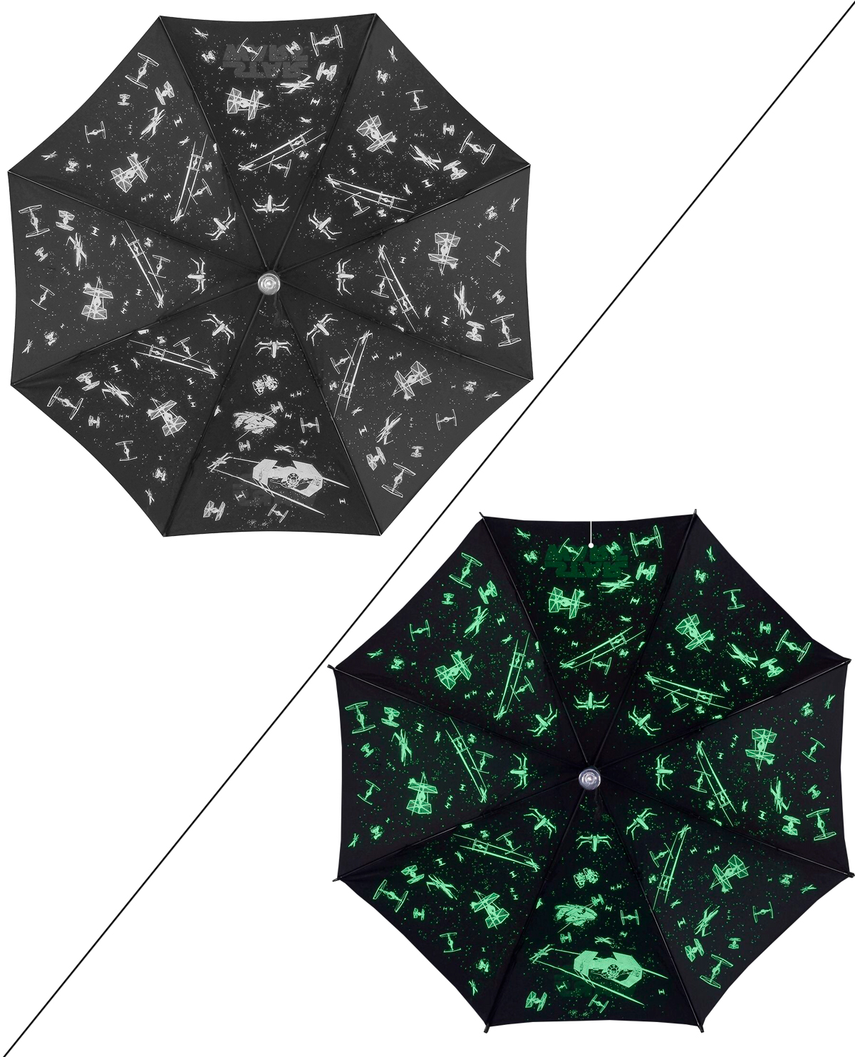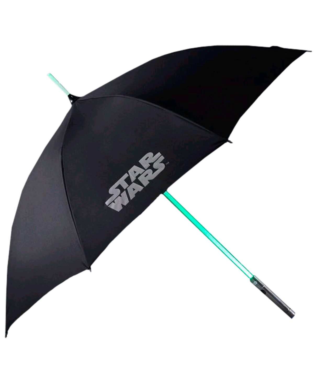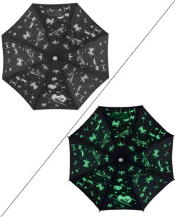 Este paraguas tiene una empuñadura de luz LED verde, luz de flash en la base y una escena de batalla brillante y fresca en el techo.