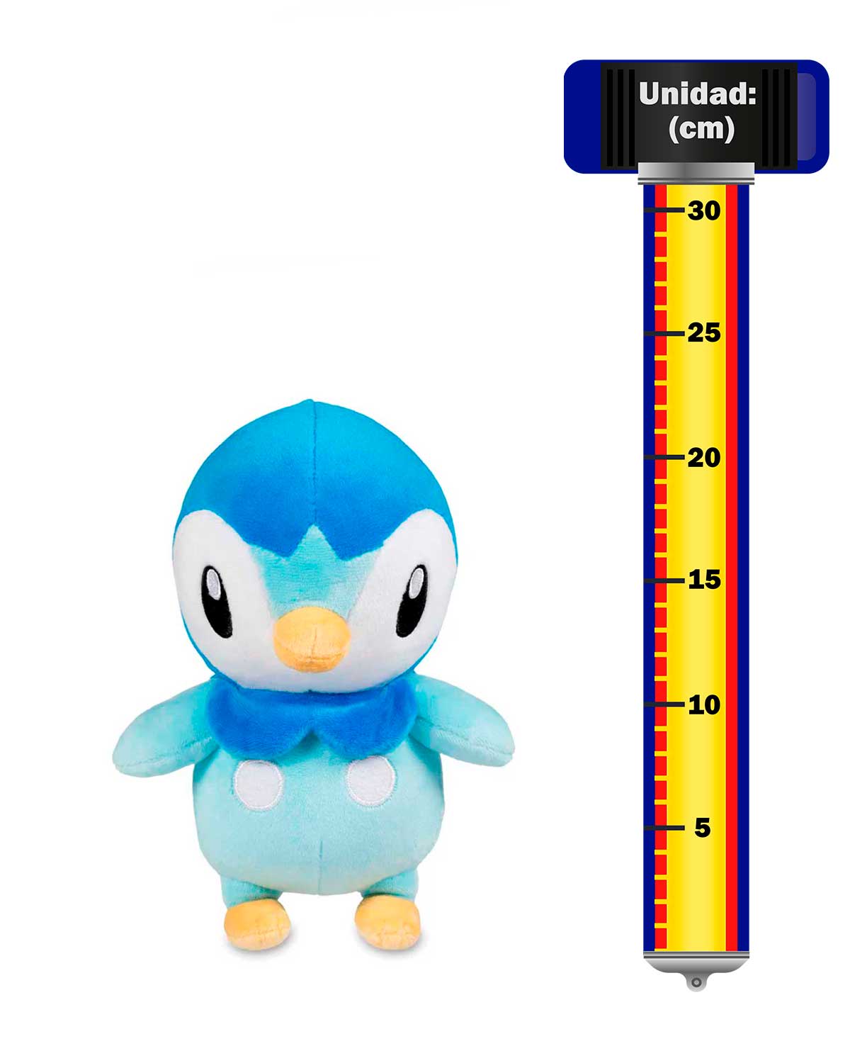- Peluche hecho de fibra de poliéster y relleno de espuma de poliuretano con aproximadamente 20 centímetros de altura.