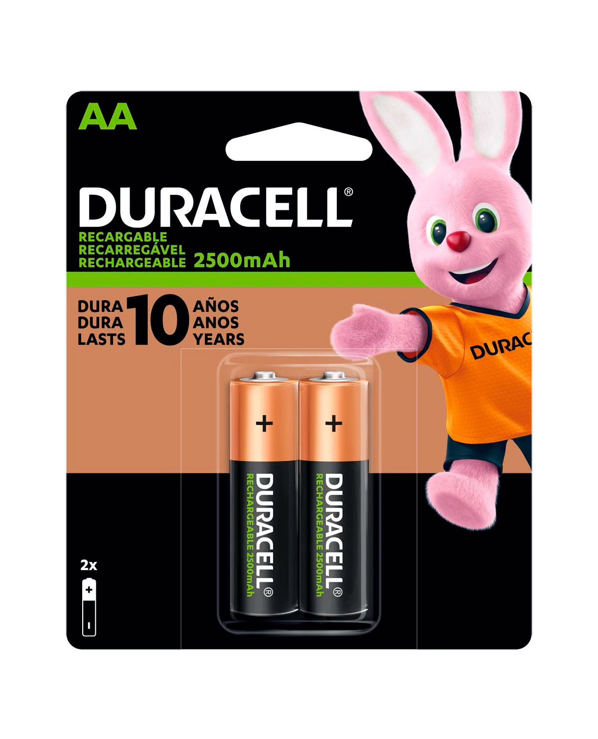 Las pilas recargables Duracell AA 2,500mAh son nuestras pilas que más duran por carga (para tamaño recargable AA, por carga en el mismo dispositivo) y te permiten 100 recargas. Con un núcleo de iones de larga vida obtienes una potencia increíble en cada pila. Además, vienen precargadas para que puedas alimentar tus dispositivos directamente y retienen la carga hasta 12 meses, cuando no están en uso. Asimismo, las pilas recargables Duracell están garantizadas para durar 5 años. Estas potentes pilas NiMH funcionan con cualquier cargador de baterías NiMH