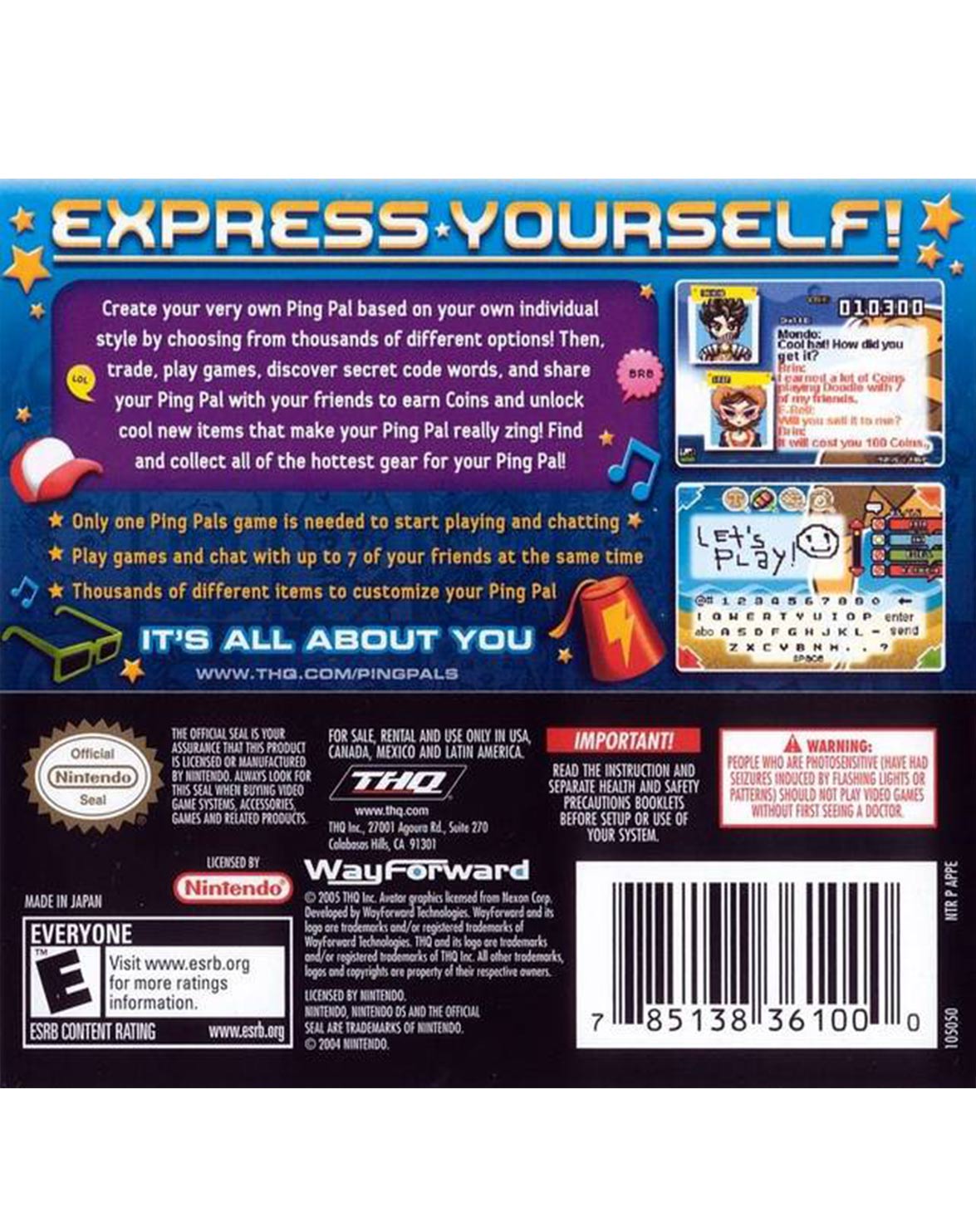 Crea tu propio Ping Pal – basado en su estilo individual – al elegir entre miles de opciones diferentes. Entonces puedes jugar, descubrir palabras secretas y compartir tu Ping Pal con tus amigos para ganar monedas y desbloquear nuevos objetos. Puedes jugar con hasta siete de tus amigos en minijuegos como Hot Potato, Doodle, Top Ten y Pick a Number. Además de jugar y negociar, puedes chatear con tus amigos.
