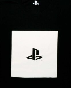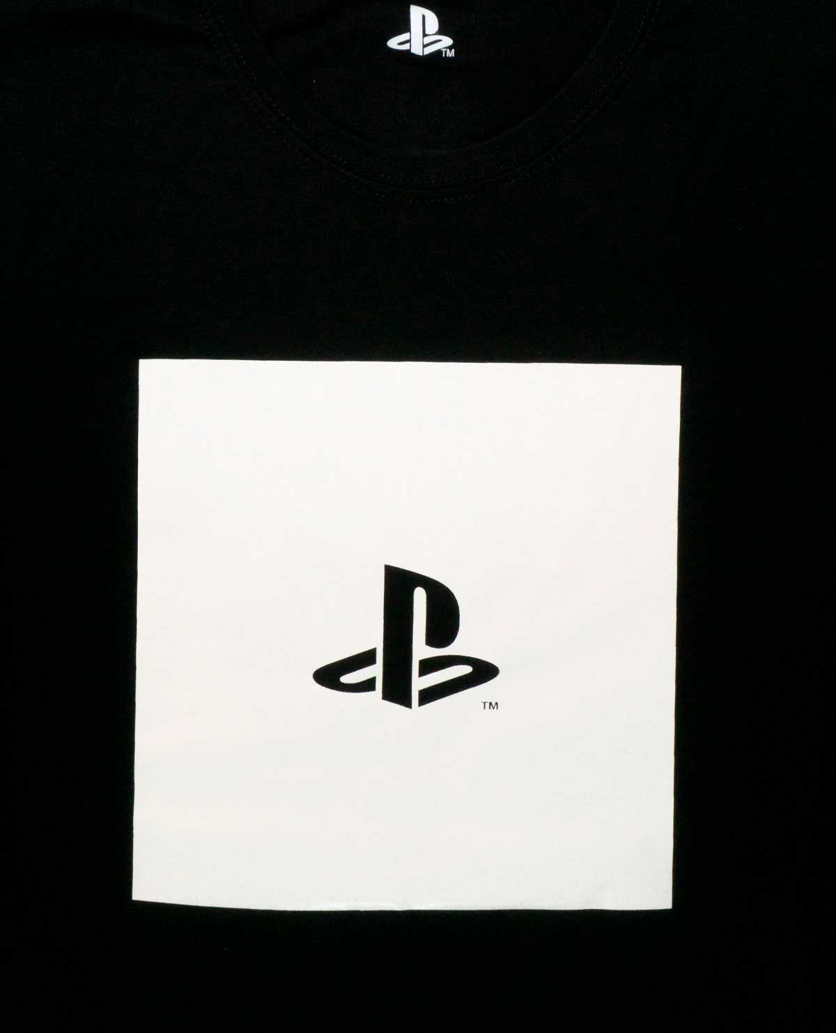 Playera negra con cuadro blanco y logo de Playstation al centro.