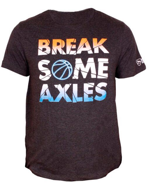 Esta camiseta tiene la frase “Break some axles” en el frente, el logo de Rocket League en una manga y el logotipo de los aros en la otra.