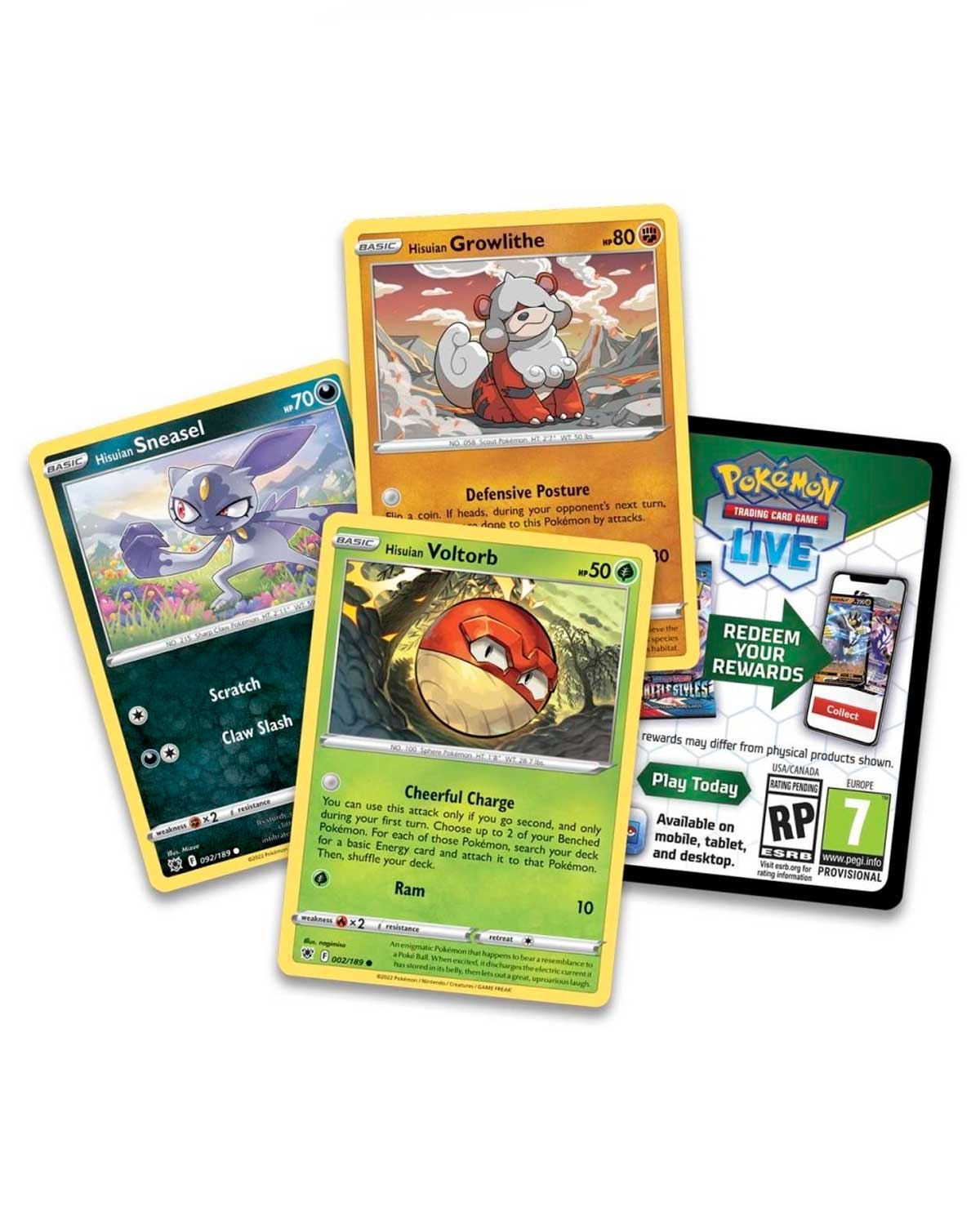 - ¡3 tarjetas de aluminio con Hisuian Voltorb, Hisuian Growlithe y Hisuian Sneasel!