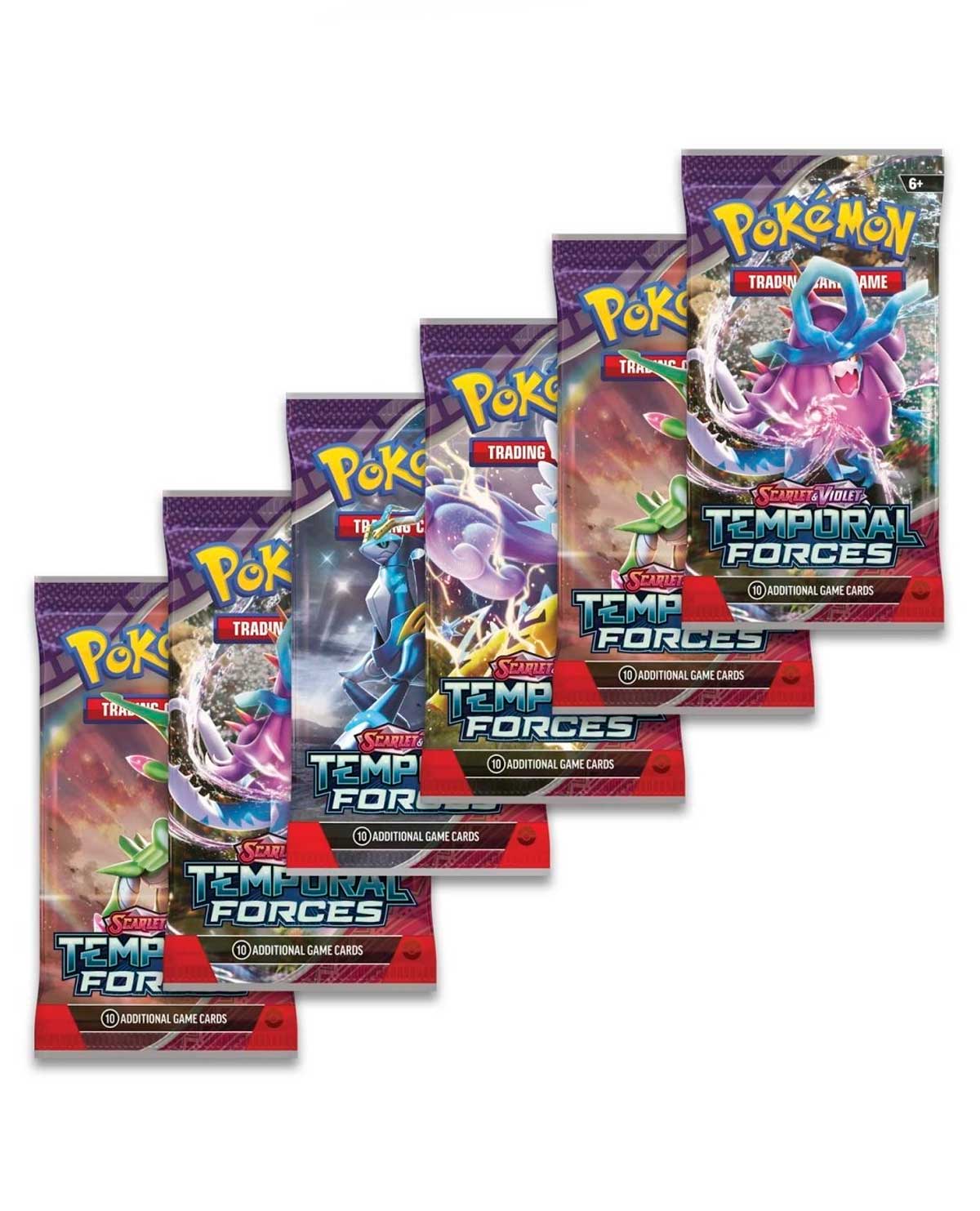 - Incluye 6 paquetes de refuerzo de Fuerzas Temporales de TCG Pokémon: Scarlet & Violet.