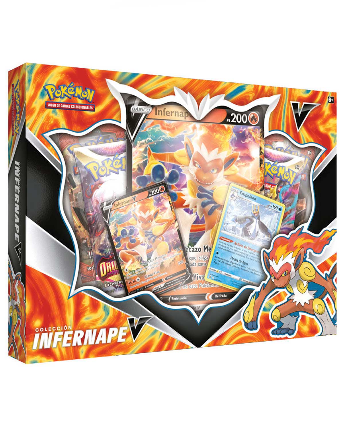En esta colección encontrarás una carta para jugar y otra de gran tamaño de Infernape V, así como una carta adicional de Empoleon. Además, obtendrás un buen puñado de paquetes de mejora de JCC Pokémon para potenciar tus barajas y completar tu colección.