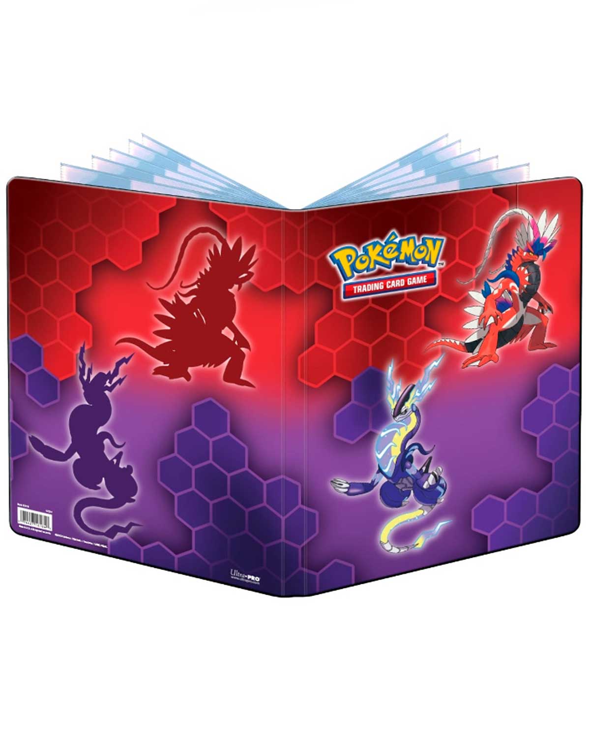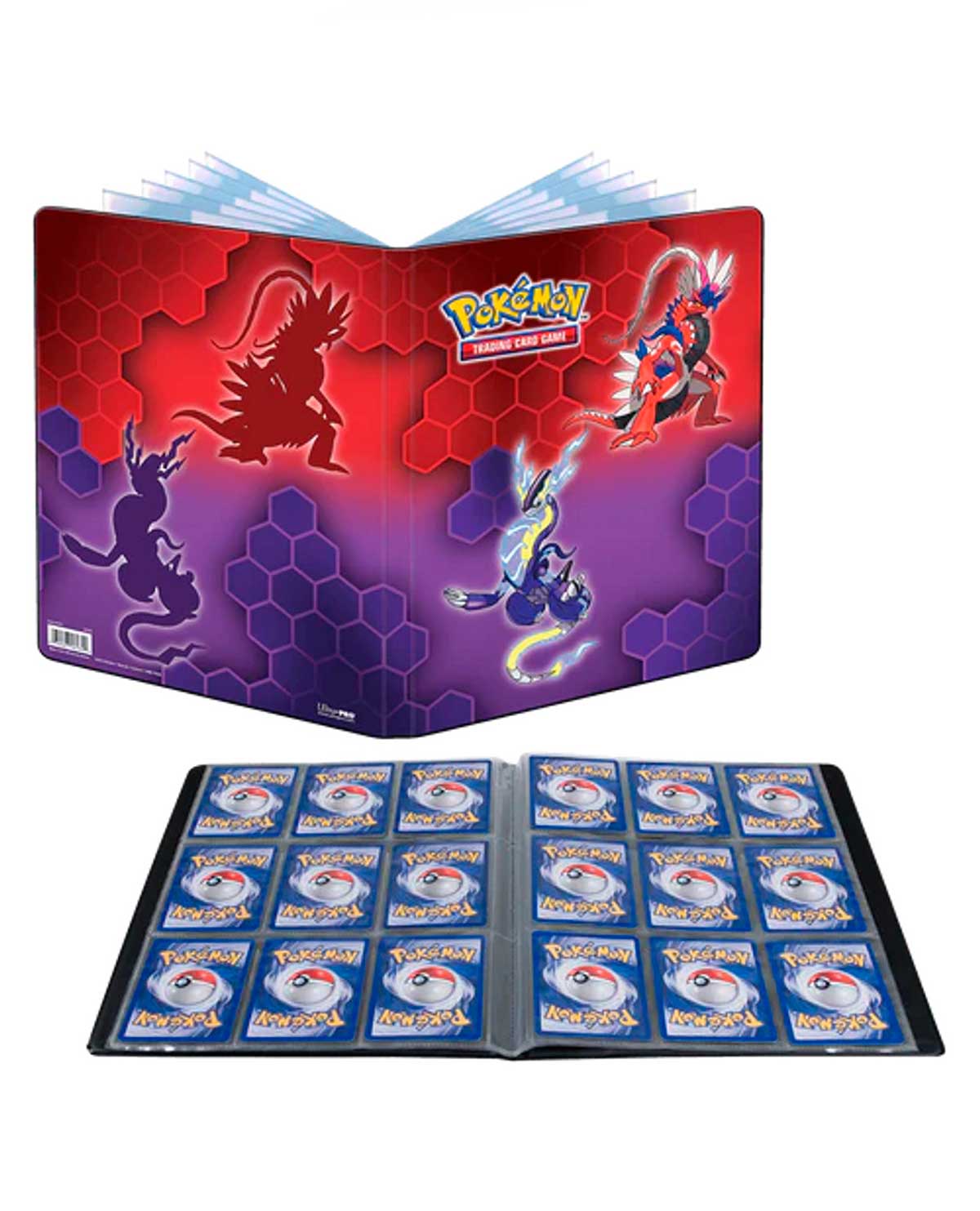 El portafolio de 9 bolsillos para Pokémon presenta una portada vibrante y con arte completo de Koraidon y Miraidon. Cada portafolio almacena y protege hasta 180 tarjetas de tamaño estándar con carga simple y 360 tarjetas con carga doble en páginas de polipropileno aptas para archivo.