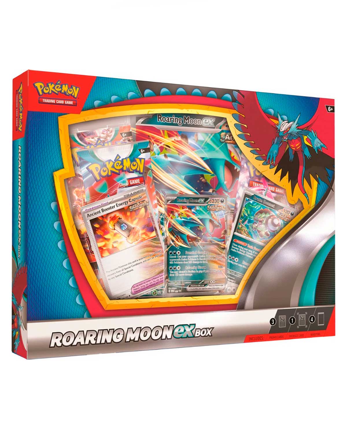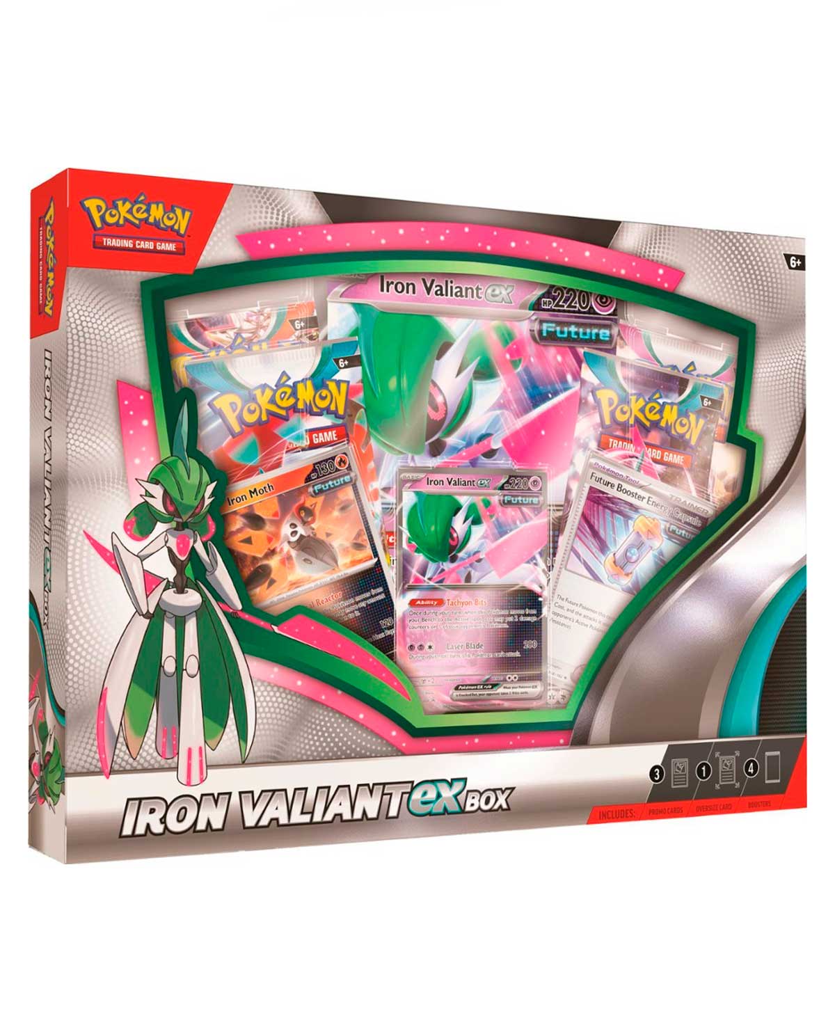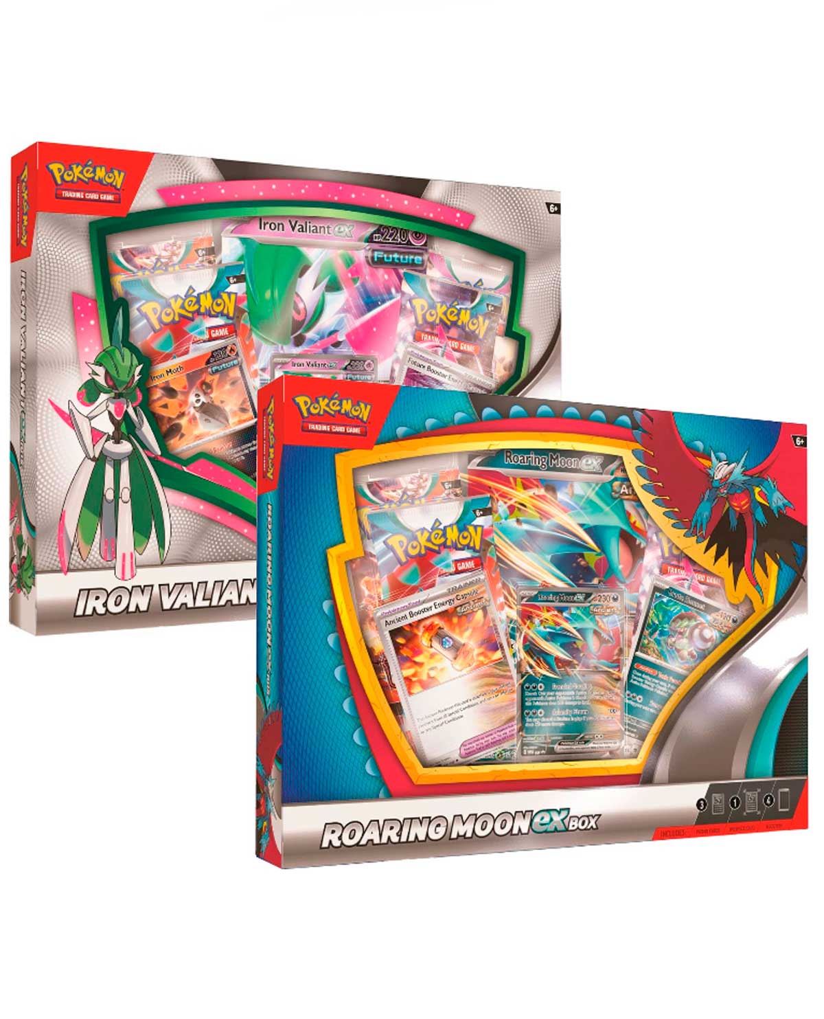 El feroz ex de Roaring Moon despierta de un mundo desaparecido hace mucho tiempo, ¡Mientras que el resistente ex Iron Valiant llega desde el futuro! En esta caja, obtienes una tarjeta promocional y una tarjeta de gran tamaño que presenta a Roaring Moon ex o Iron Valiant ex.