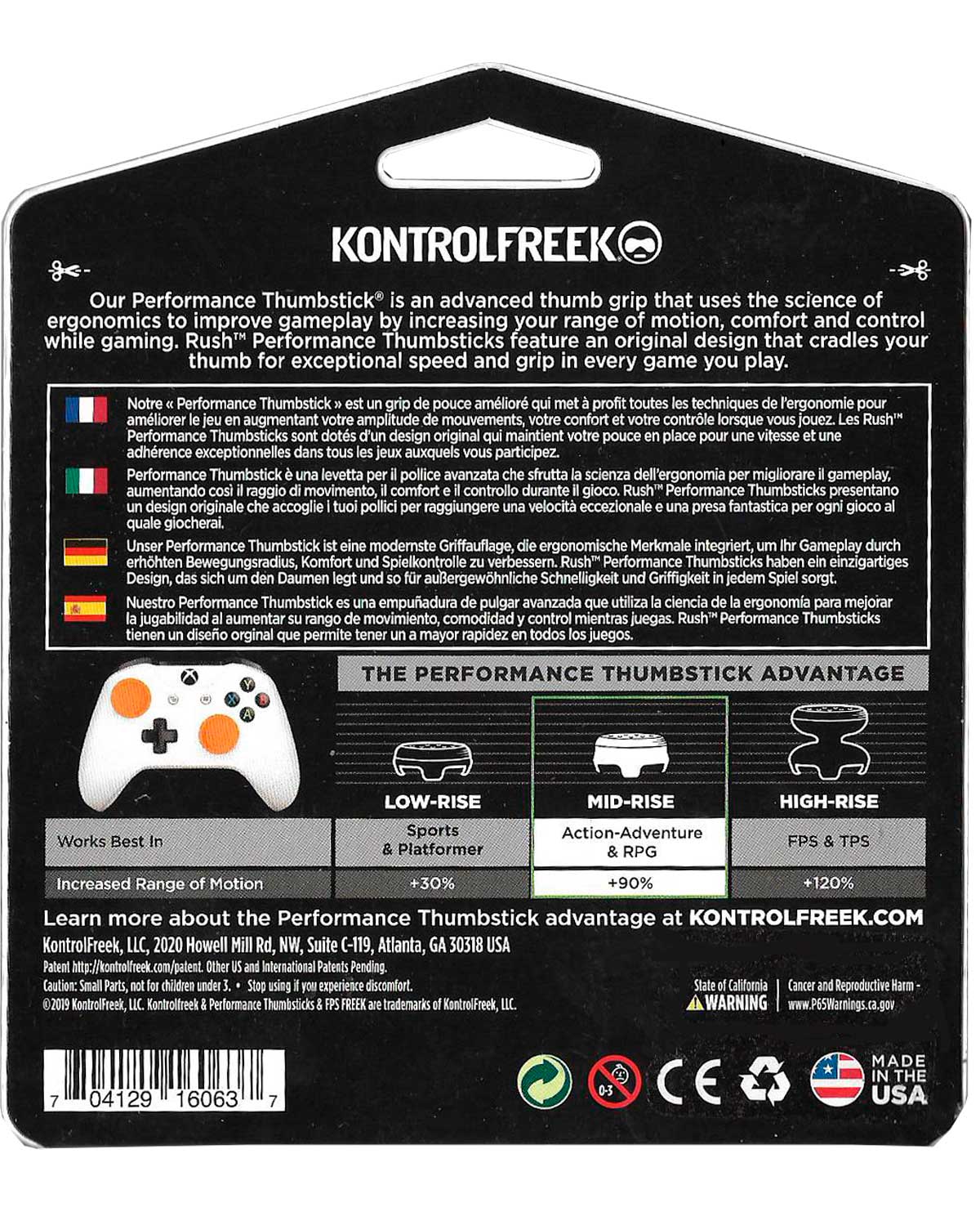 KontrolFreek Rush es un Thumbstick de altura media y audaz, con un diseño amplio y de borde elevado. Acomoda tu pulgar para una velocidad y agarre excepcionales en cada juego que disfrutes. Rush presenta una variación más suave del material compuesto patentado por Kontrol Freek, para que tengas una sensación más cómoda y personalizada mientras juegas.