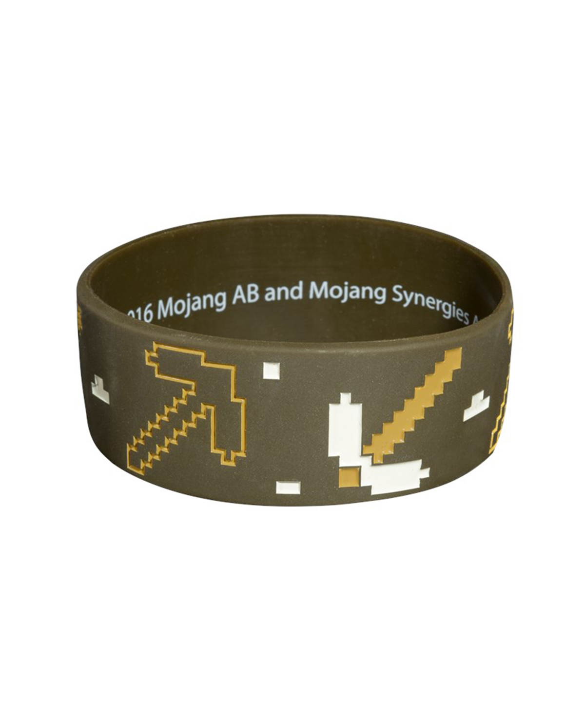 Pulsera de color marrón cubierta en iconos de minería y símbolos de Minecraft.