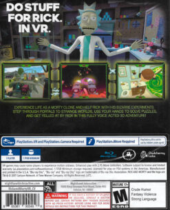¡Rick y Morty se han teletransportado a tu sala de estar para una aventura innovadora de Realidad Virtual! Juega como un clon de Morty mientras exploras el garaje de Rick, la casa de los Smith, y los mundos alienígenas. Experimenta la vida como clon de Morty y todas las situaciones traumáticas que eso conlleva. Atraviesa portales a mundos extraños, ayuda a Rick y a sus experimentos bizarros y usa tus manos de Realidad Virtual para recoger y jugar en una Rickalidad 3D completamente interactiva. Sigue las instrucciones de Rick (¡o no!) para resolver acertijos y completar misiones en esta aventura realizada íntegramente con actuaciones de voz.