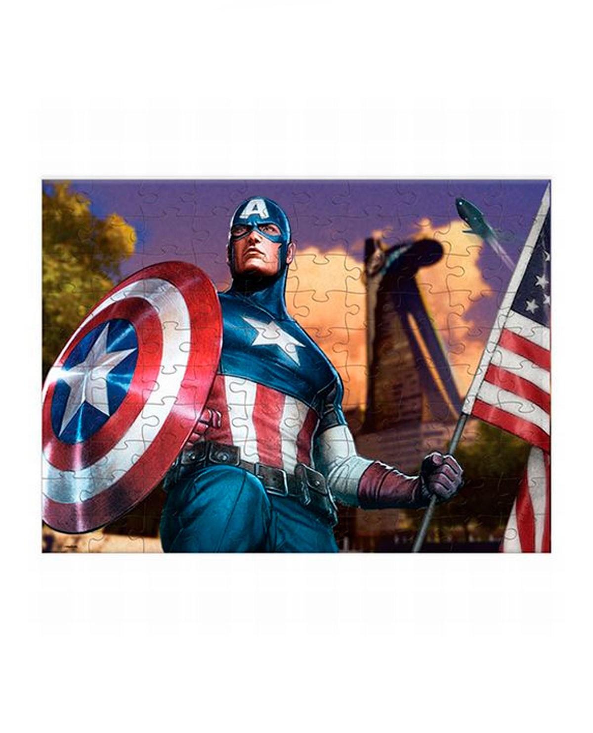 Rompecabezas coleccionable de 100 piezas de cartón del Capitán América, en práctico estuche metálico con la forma de una A de Avengers con relieve en tapa.