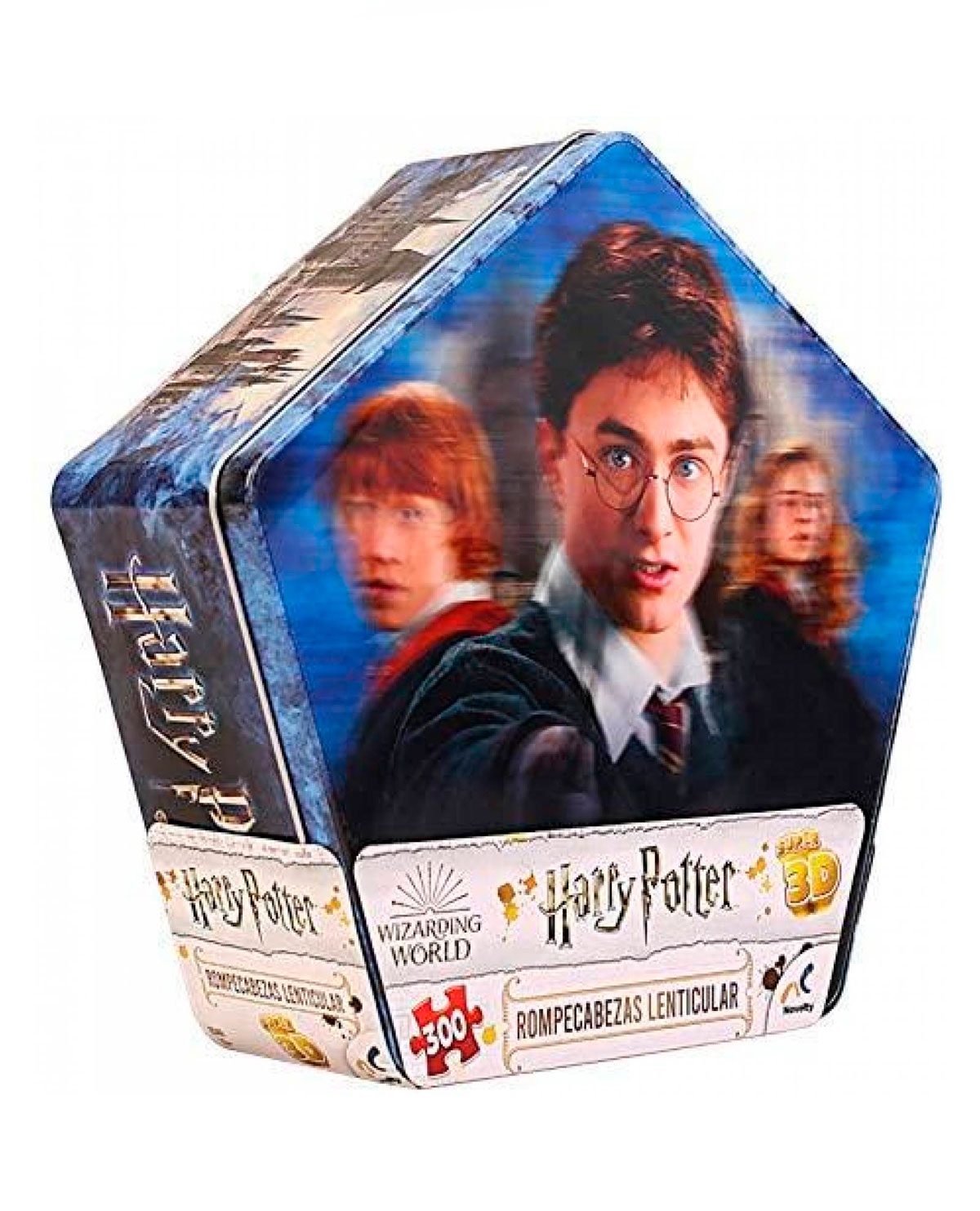 Estuche metálico en forma de pentágono con imagen lenticular de Harry Potter en la tapa. Incluye un rompecabezas lenticular de 250 piezas con una imagen que te brindará un efecto de profundidad y movimiento al contener mayor cantidad de capas en su impresión al ser super 3D