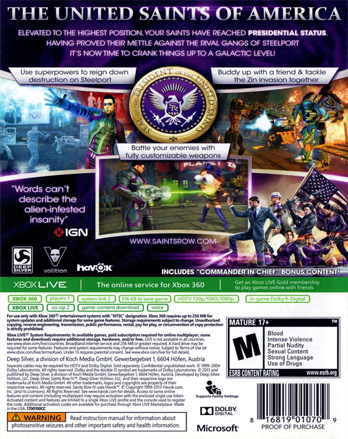 Saints Row IV es un juego de mundo abierto que continúa la historia de la Tercera Street Saints elevando su estado al más alto nivel – los líderes del mundo libre.