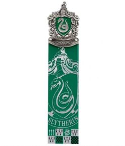HARRY POTTER SEPARADOR DE LIBRO SLYTHERIN Escudo de metal fundido a presión y esmaltado a mano, la parte inferior se duplica en una lámina de PVC y una hoja de cartón en la que se imprime el escudo de armas de la casa. Mide 6 pulgadas de largo