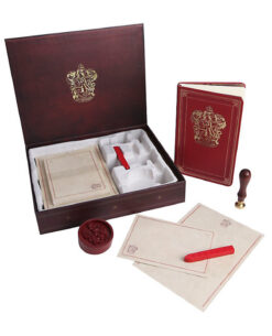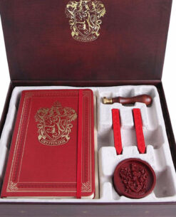 Este conjunto coleccionable de lujo incluye un diario en blanco de 192 páginas, un sello de cera y dos palos de cera, papel para escribir cartas, sobres y un pisapapeles, todos con la icónica cresta de Gryffindor.
