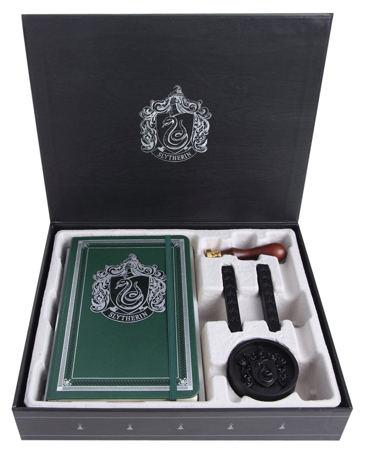 Celebra el arte de las películas de Harry Potter con este juego de artículos de temática Slytherin, inspirado en los colores y la heráldica de la casa más astuta de Hogwarts.