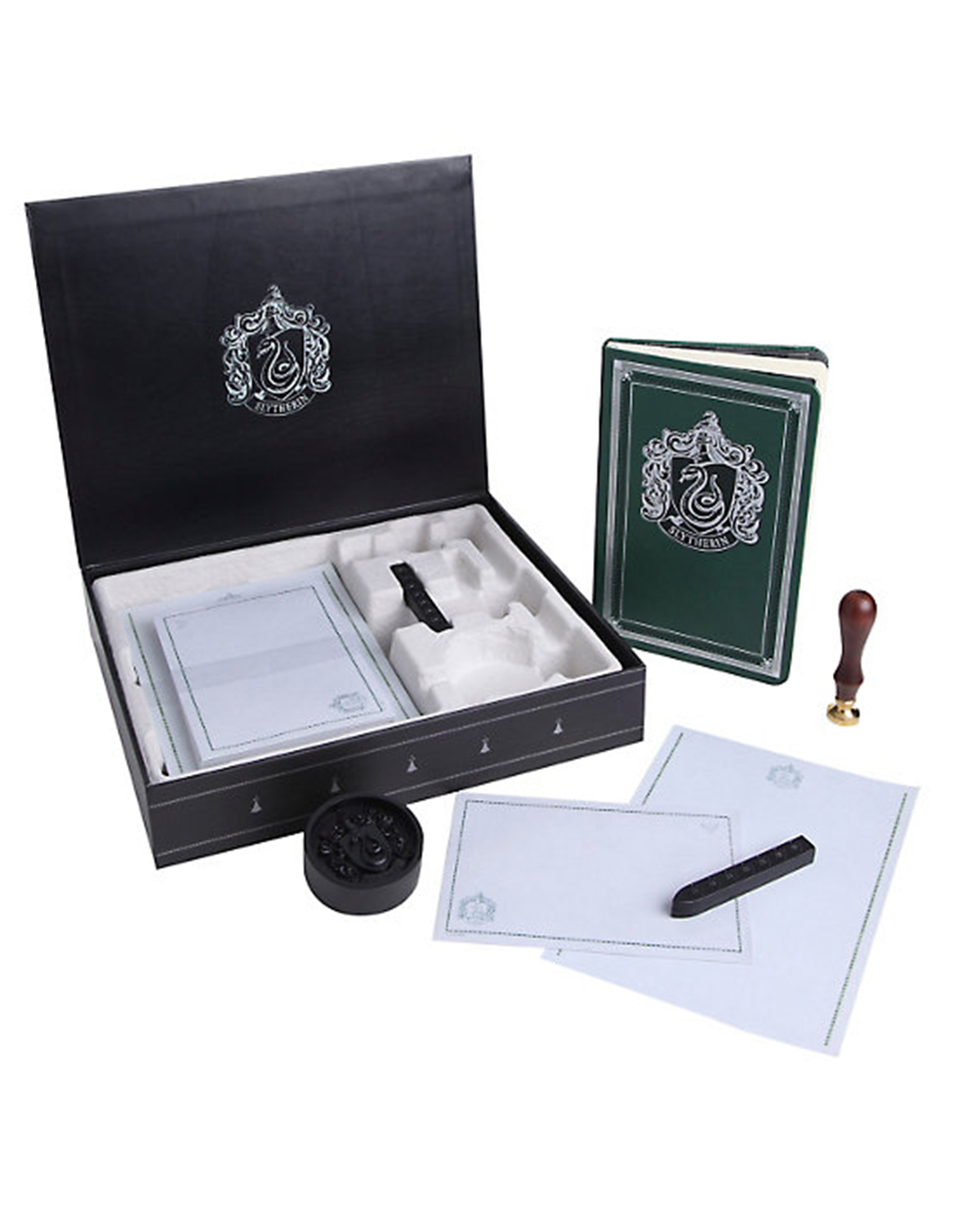Este conjunto coleccionable de lujo incluye un diario en blanco de 192 páginas, un sello de cera y dos palos de cera, papel para escribir cartas, sobres y un pisapapeles, todos con la icónica víbora de Slytherin.