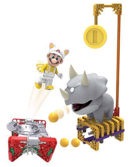 ¡Ve a una nueva aventura con Mario Racoon Blanco peleando contra Reznor! El set armable de la serie de Super Mario Bros que permite a Mario brincar como lo hace en el juego. Arma a tu Mario y lánzalo contra Reznor con la plataforma de disparo, ¡si logras juntar las monedas ganarás! el set contiene 1 Mario Racoon blanco armable, 1 Reznor armable y 1 escenario con plataforma armable.