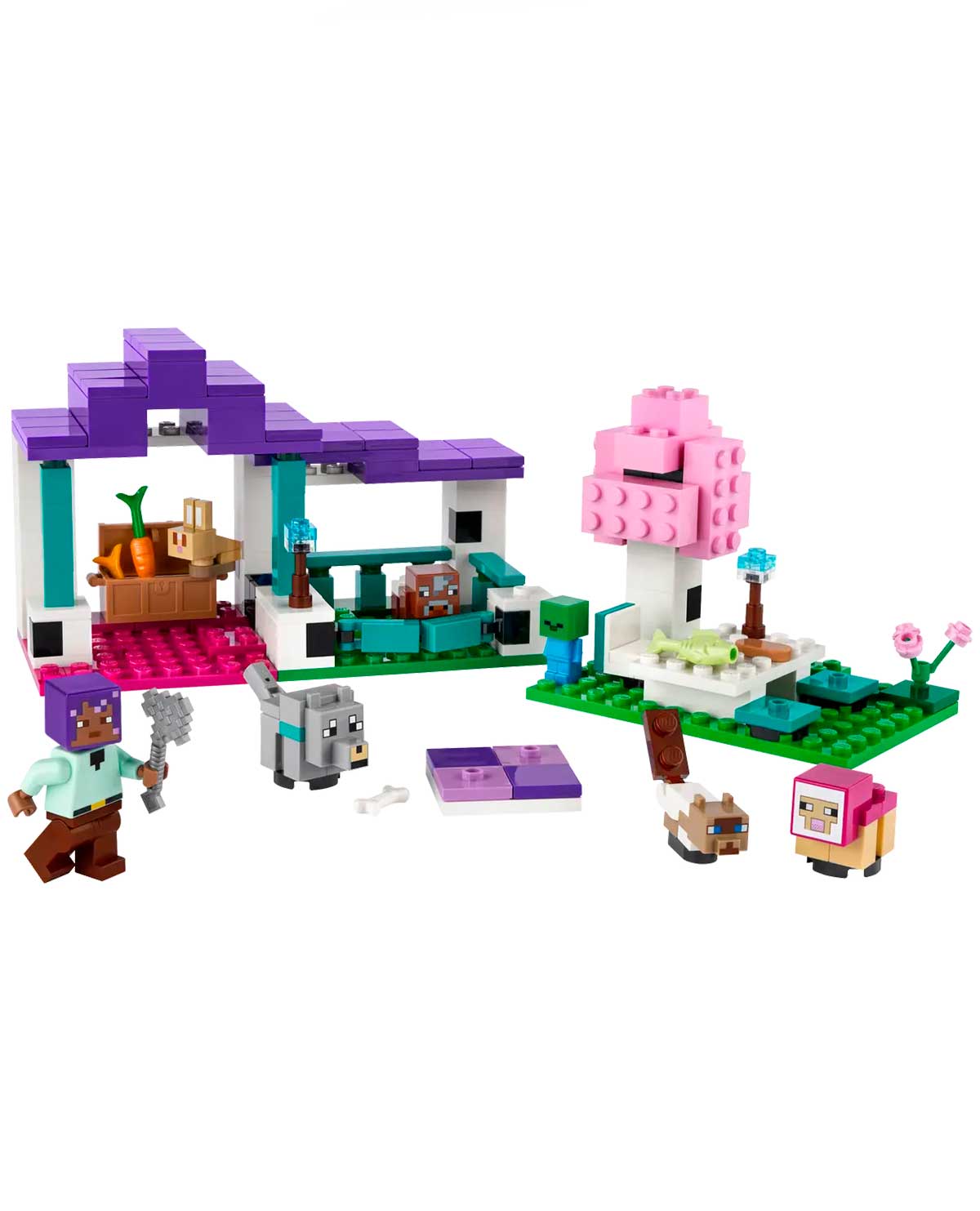 Este set ambientado en el bioma Llanura tiene 3 zonas: un espacio de juego vallado con una puerta y una habitación con un cofre lleno de comida para animales, como un hueso, una zanahoria y trigo; un área depícnic con una mesa bajo un árbol; y una alfombra donde pueden echarse los animales cansados. Además de su cuidador, Efe, el set contiene varias criaturas bebés, como un gato, una oveja magenta, un lobo, un conejo, una vaca Minecraft… e incluso un zombi bebé Minecraft.