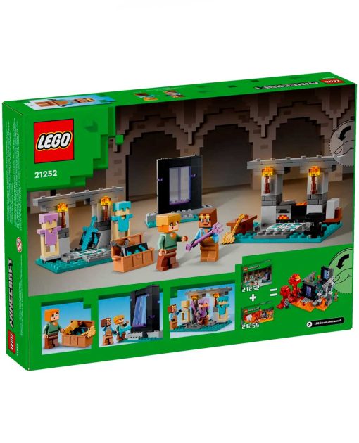 - Una famosa heroína y más juguetes: Contiene minifiguras de los personajes Minecraft Alex y el armero, 3 entornos construibles, y una armadura y armas Minecraft, como un hacha dorada, 2 espadas, 2 escudos y un tridente encantado.