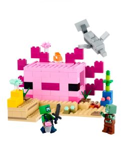 Los niños usan sus habilidades Minecraft para construir una enorme casa de brillantes colores con la forma del popular ajolote del juego. Después, acompañan a un Buceador Explorador en infinitas aventuras con un delfín buscatesoros, un pez globo, 2 ajolotes adultos, un ajolote en un cubo y un cofre del tesoro hundido.