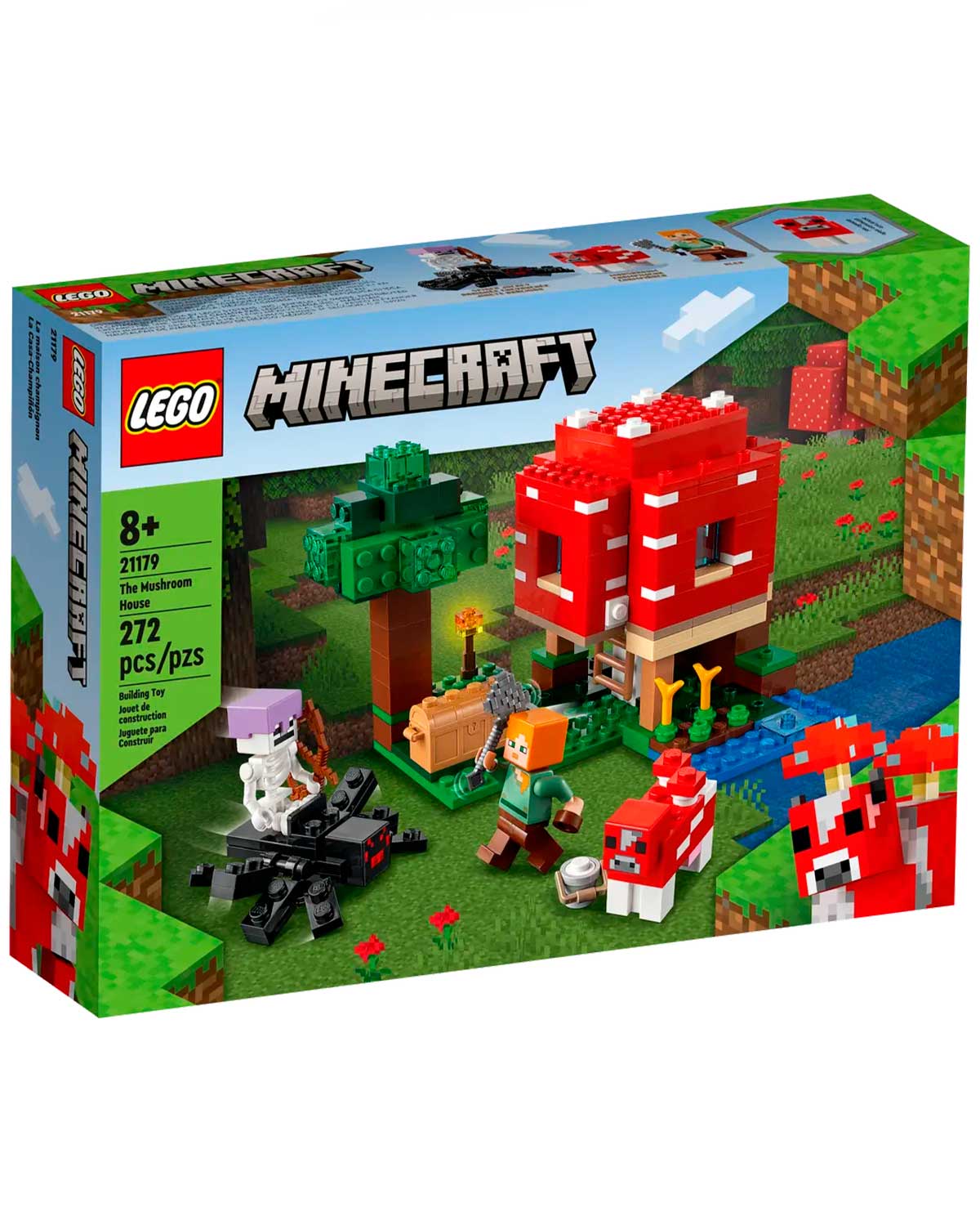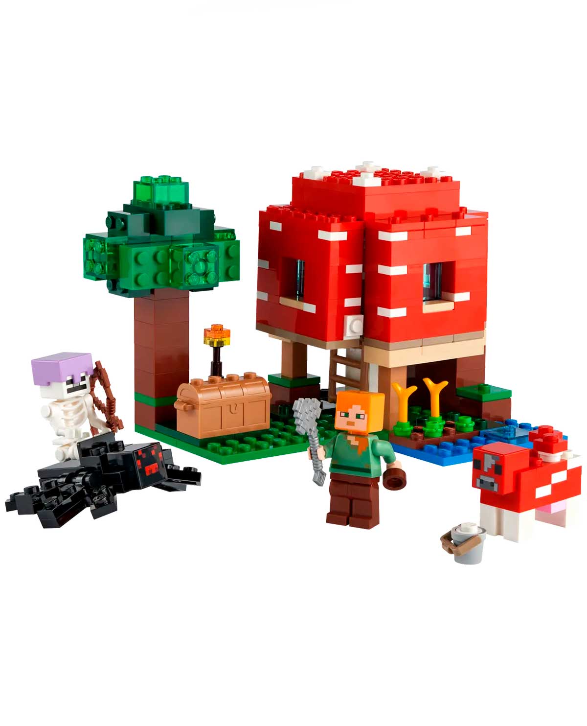 Los jugadores de Minecraft podrán poner en marcha su creatividad en el mundo real construyendo una casa dentro de un champiñón gigante. Las paredes y el techo desmontables facilitan el acceso a la mesa de trabajo y el mobiliario. En el exterior, Alex, la heroína de Minecraft, usa un cuenco para recoger sopa de la vaca champiñaca.