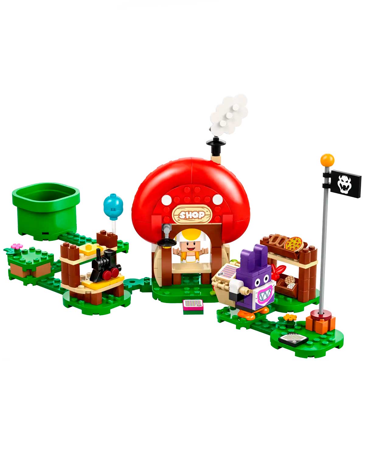 Una divertida idea de regalo para fans de Super Mario de 7 años o más, incluye 2 personajes Super Mario para construir (un Toad Amarillo y una figura de juguete de un Caco Gazapo), así como una tienda de alimentación y juguetes, y también un carrito de la compra para fomentar el juego de interpretación creativo.