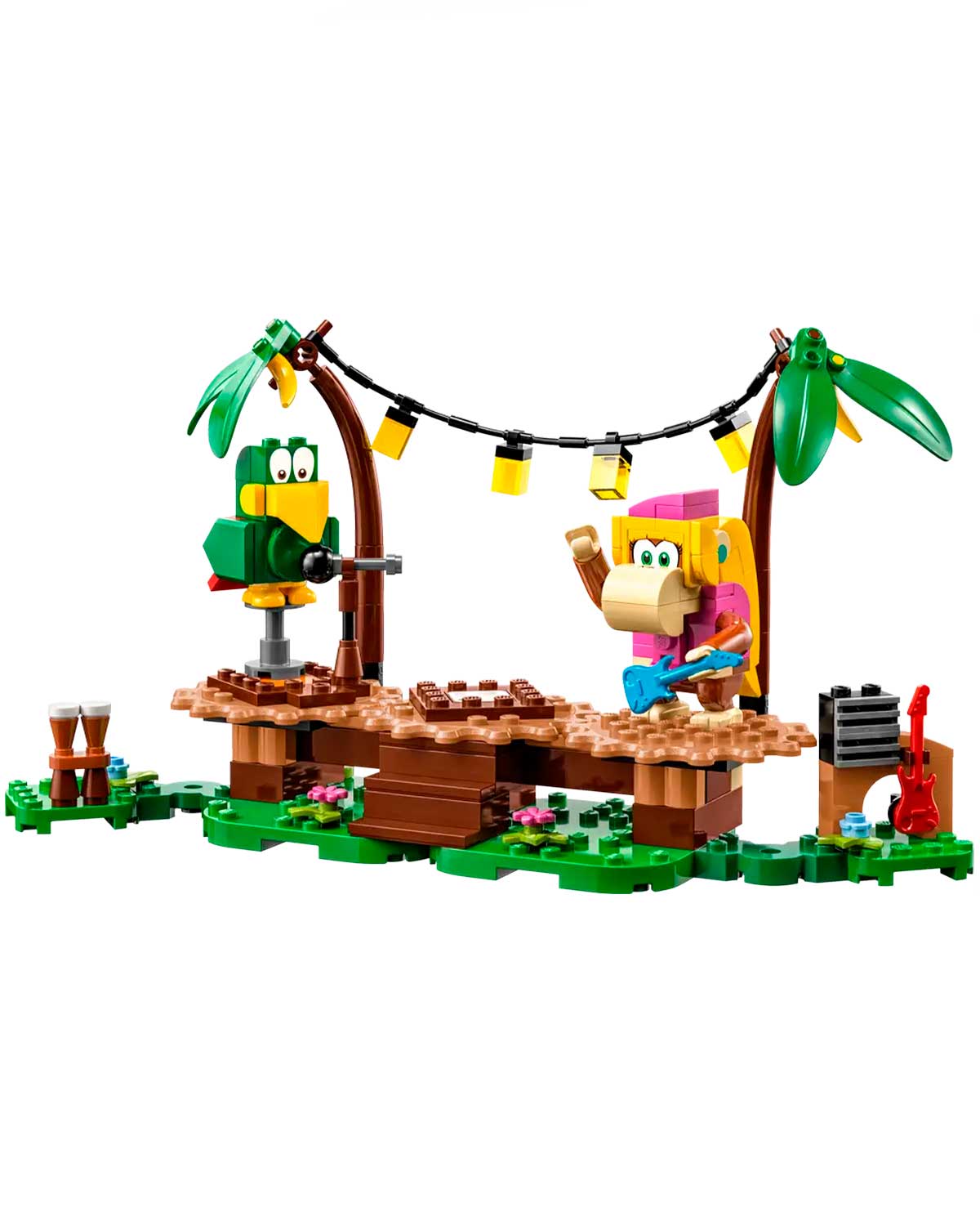 - 2 personajes LEGO Super Mario del hogar selvático de Donkey Kong: Dixie Kong con un elemento de guitarra y el loro Squawks con un micrófono para construir, además de bongos y un amplificador para construir.