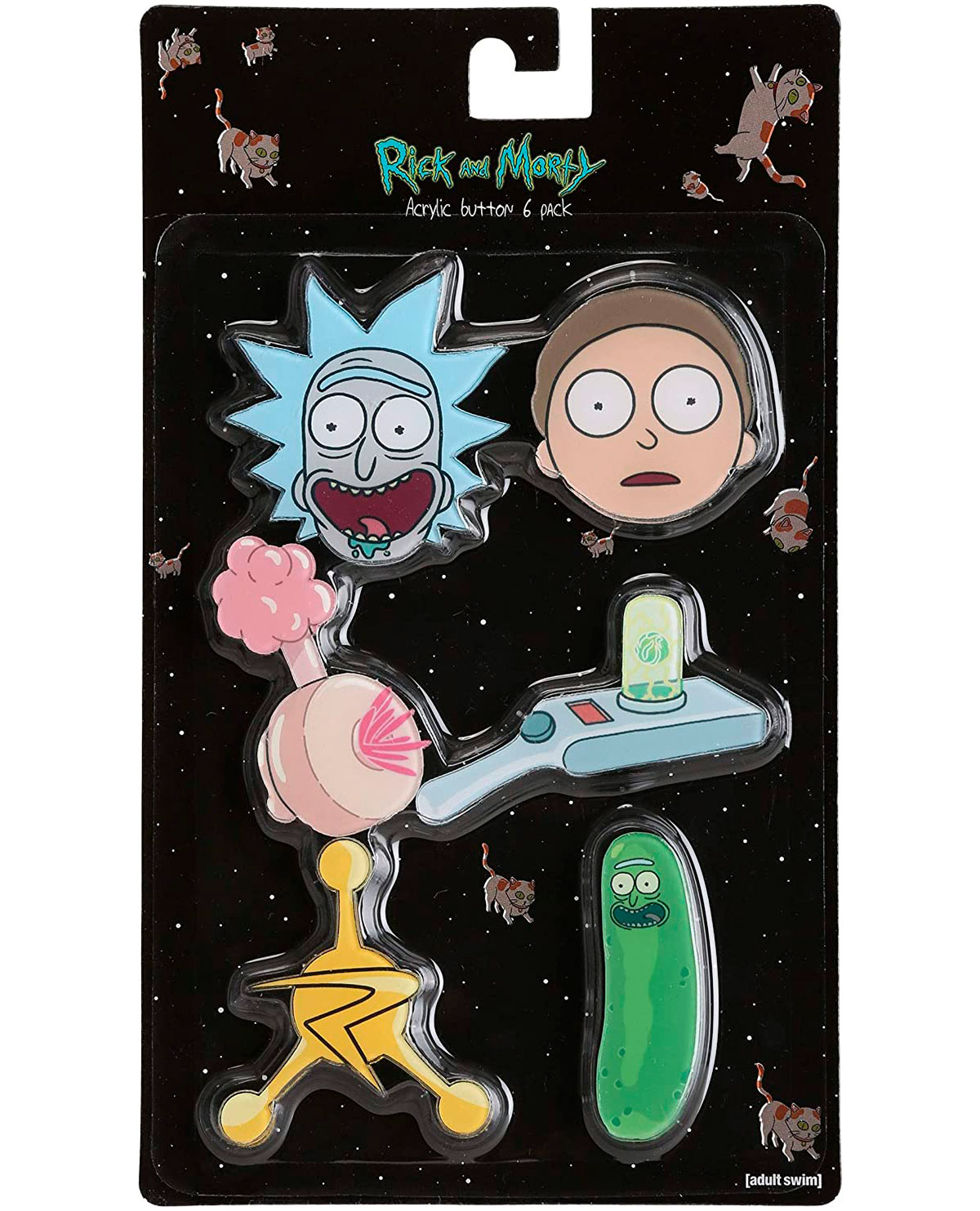 Con este set de 6 pines podrás llevar contigo a Rick, Morty, Pickle Rick, entre otros.