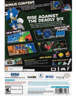 En su último intento por derrotar a Sonic y dominar el mundo, el Dr. Eggman cuenta con el poder de seis criaturas aterradoras: Los Mortíferos Seis. Sin embargo, cuando estos se rebelan contra su nuevo amo, a Sonic no le queda otra que aliarse con su archienemigo, el Dr. Eggman, y explorar Héxagon para poder vencerlos. Utiliza los nuevos y alucinantes movimientos de Sonic y sus increíbles poderes de color para explorar diferentes y únicos territorios, ¡corriendo dentro, fuera e incluso del revés en cada nivel!