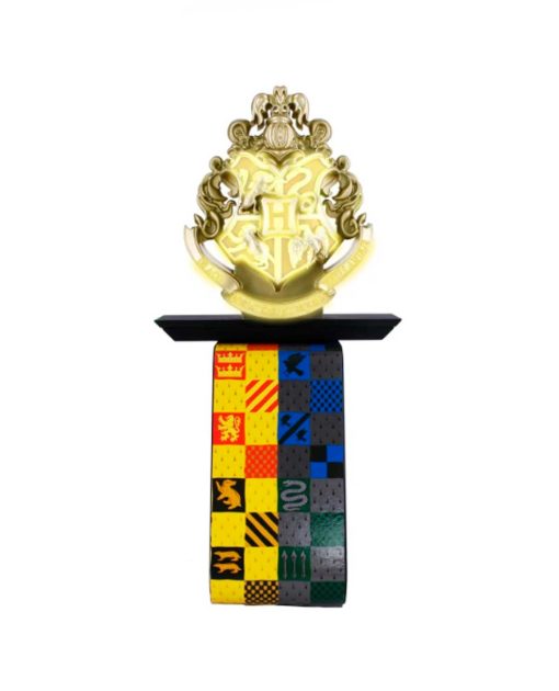 - Columna negra con borde iluminado por LED amarillo, rematada con un escudo de Hogwarts iluminado y detallada con una calcomanía que celebra las cuatro casas en el frente de la columna.