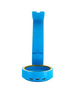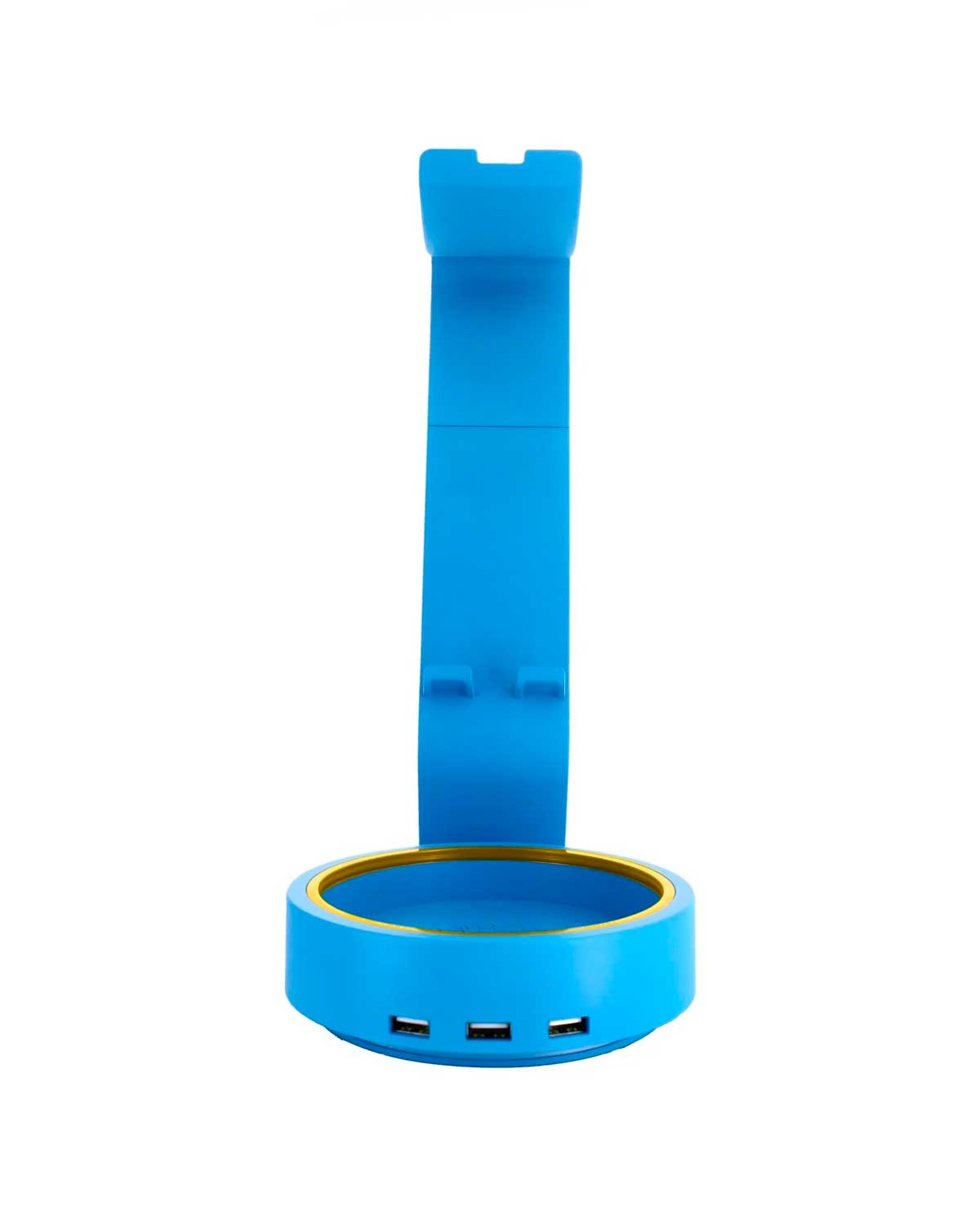 El tambor de carga central ahora alberga 3 puertos USB que permiten encendidos simultáneos para todas sus necesidades electrónicas. La iluminación Halo, sensible al impacto, se activa cuando se coloca cualquier cable dentro de la base circular. Y el brazo fijo, ahora más ancho y grueso para brindar un soporte más seguro, se extiende hasta el soporte para auriculares acolchado de silicona en la parte superior.