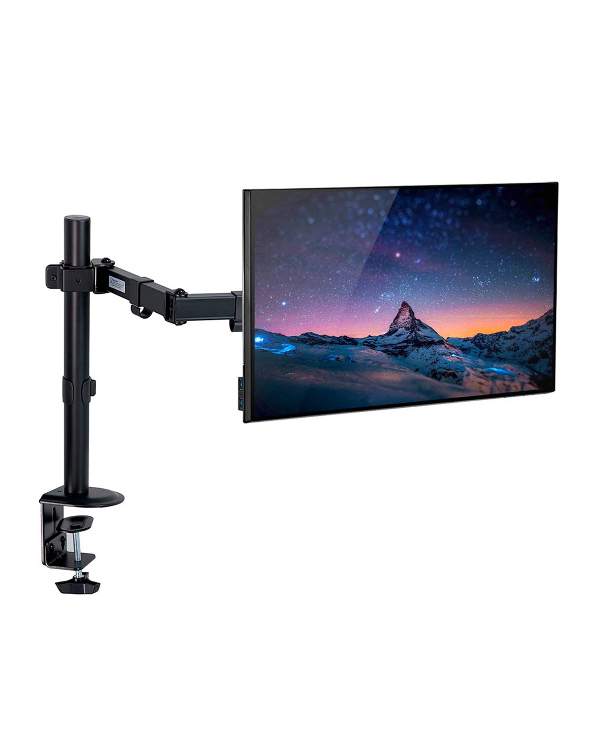 El soporte para monitor posee 4 movimientos libres: la rotación completa del soporte, el movimiento del cabezal de manera horizontal, girarla para colocar la pantalla de manera vertical y movimiento del codo del brazo.