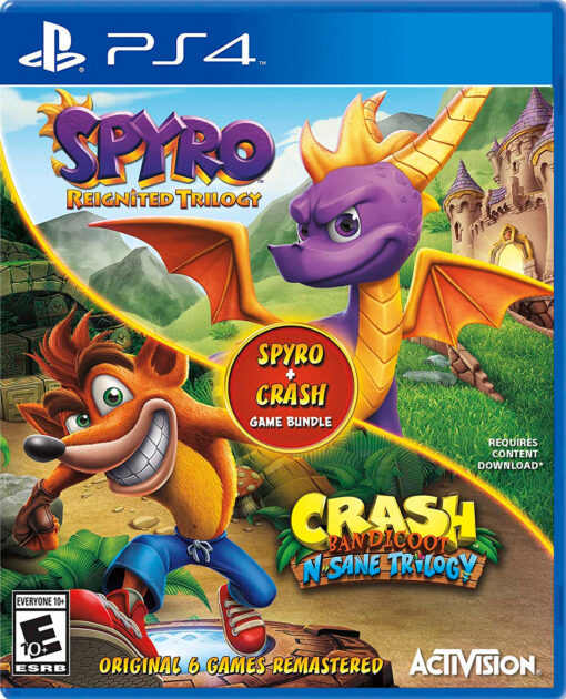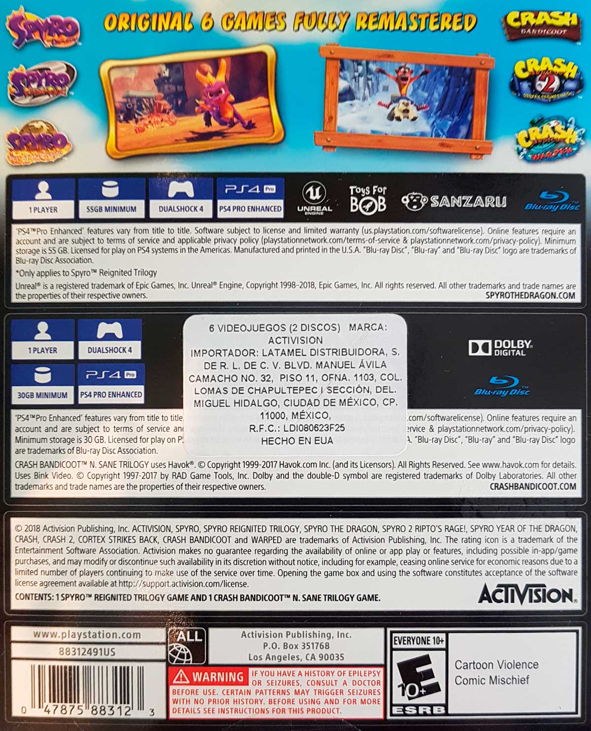 Las leyendas regresan en el paquete de juegos de Spyro + Crash Remastered para PS4. Duplica la diversión, obtienes 2 trilogías totalmente remasterizadas, la Trilogía Spyro Reignited y la Trilogía Crash Bandicoot N. Sane, para un total de 6 juegos icónicos.