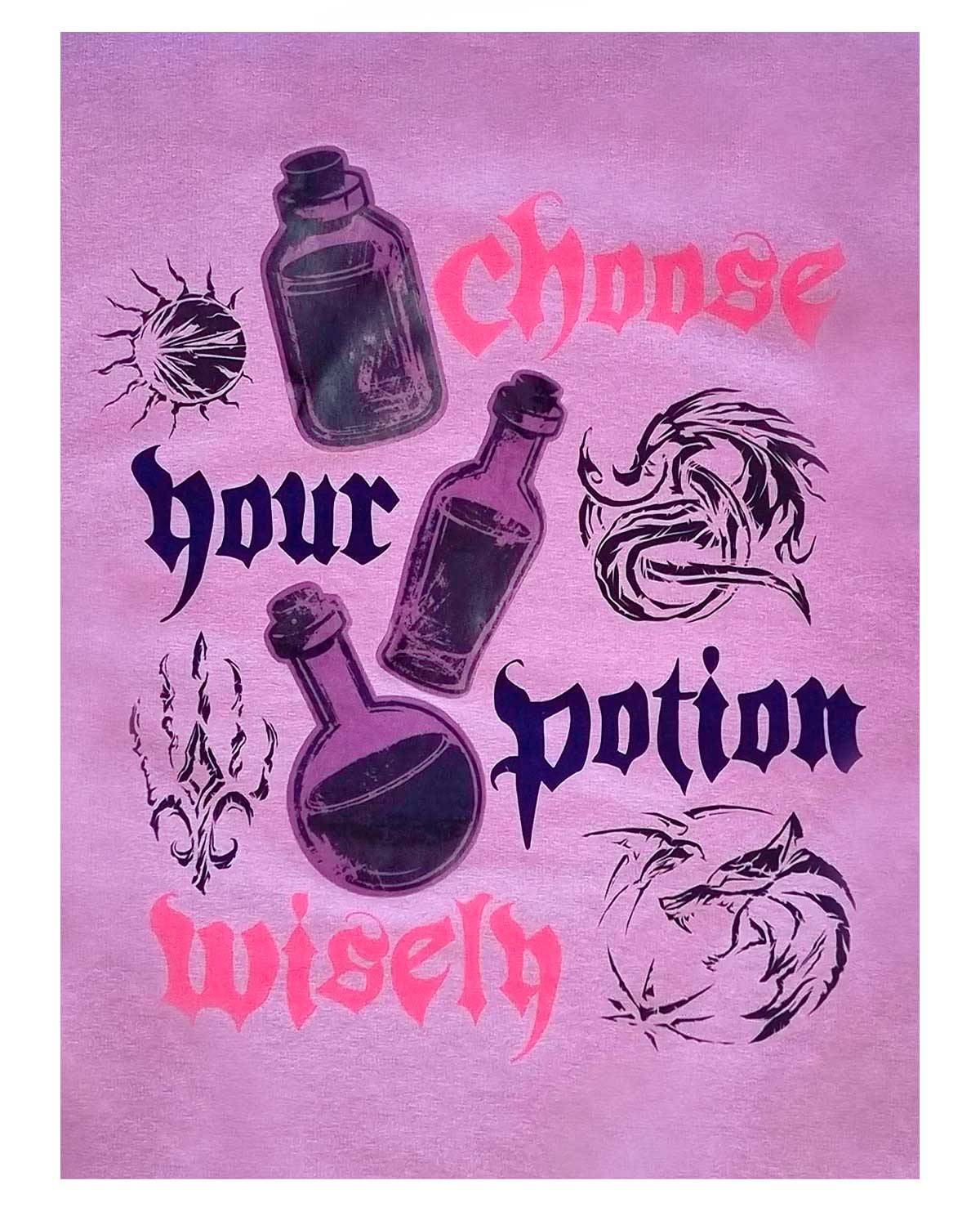 En el frente, se encuentra un diseño inspirado en la palabra "Chaos". También, podrás admirar los icónicos símbolos de los personajes con la frase "Choose Your Potion Wisely". Este detalle distintivo muestra tu afinidad por los caminos de la magia, las criaturas fantásticas y las aventuras sin igual.