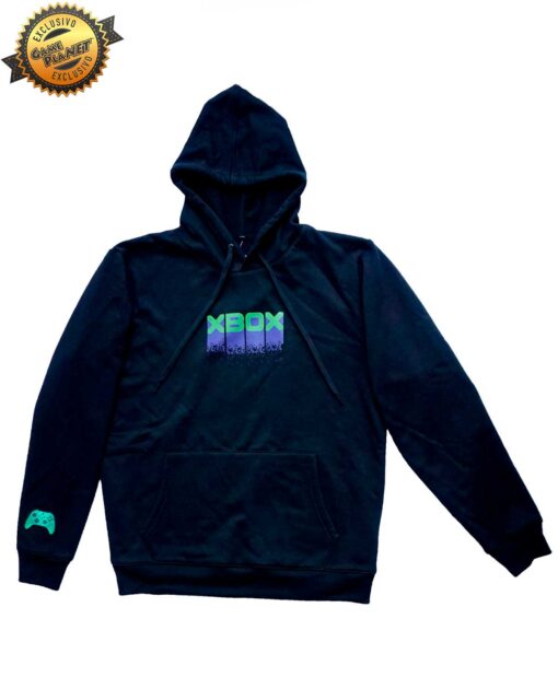 Sudadera negra con símbolos en la espalda y logo Xbox al frente en serigrafía. Parche bordado en manga.