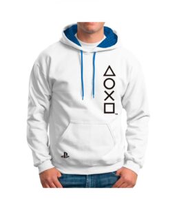 Sudadera blanca con símbolos bordados de lado izquierdo en negro y logo de Playstation bordado en el bolsillo tipo canguro.