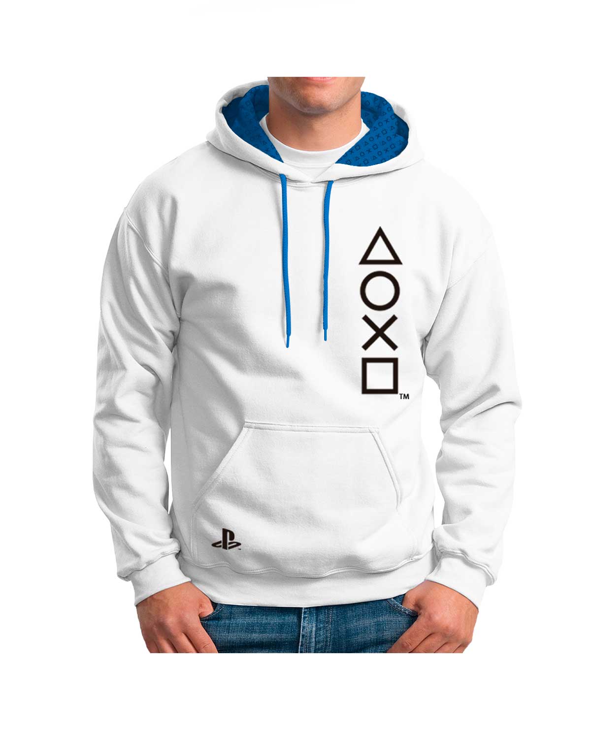 Sudadera blanca con símbolos bordados de lado izquierdo en negro y logo de Playstation bordado en el bolsillo tipo canguro.
