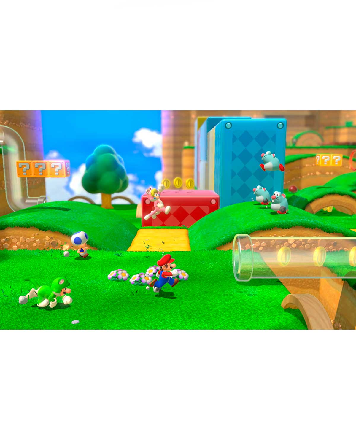 En Super Mario 3D World escoge a Mario, Luigi, Peach o Toad, y emprende tu viaje para salvar al Reino de las hadas. Cada personaje tiene un estilo de juego distinto. Luigi puede saltar muy alto y Peach puede flotar por un corto tiempo. ¡Rosalina también está disponible como personaje jugable más adelante en el juego! Salta, corre y araña para completar el objetivo mientras recolectas estrellas verdes, monedas y mejoras.