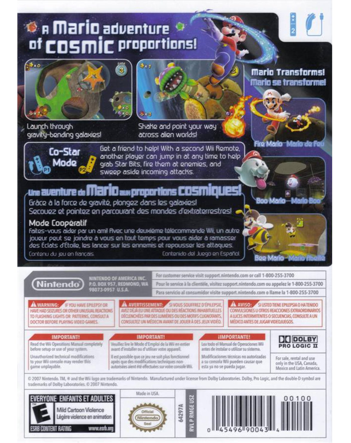Toda la magia de Mario esta presente en este titulo, y ahora con el control de tu Wii lo podrás controlar mejor que nunca, tu vas a controlarlo con el stick de tu control, para realizar tus movimientos giratorios es necesario agitar el control, inclusive podrás apuntar con el Wii Remote a los pedazos de polvo cósmico que aparecerán en la pantalla para coleccionarlo o lanzarlo hacia las estrellas.