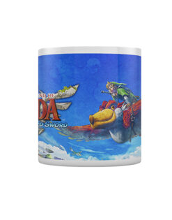 Esta increíble taza está inspirada en The Legend of Zelda: Skyward Sword, mostrando el cielo azul mientras Link vuela entre las esponjosas nubes blancas hacia el icónico logo de la Trifuerza.