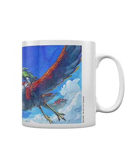 Esta increíble taza está inspirada en The Legend of Zelda: Skyward Sword, mostrando el cielo azul mientras Link vuela entre las esponjosas nubes blancas hacia el icónico logo de la Trifuerza.