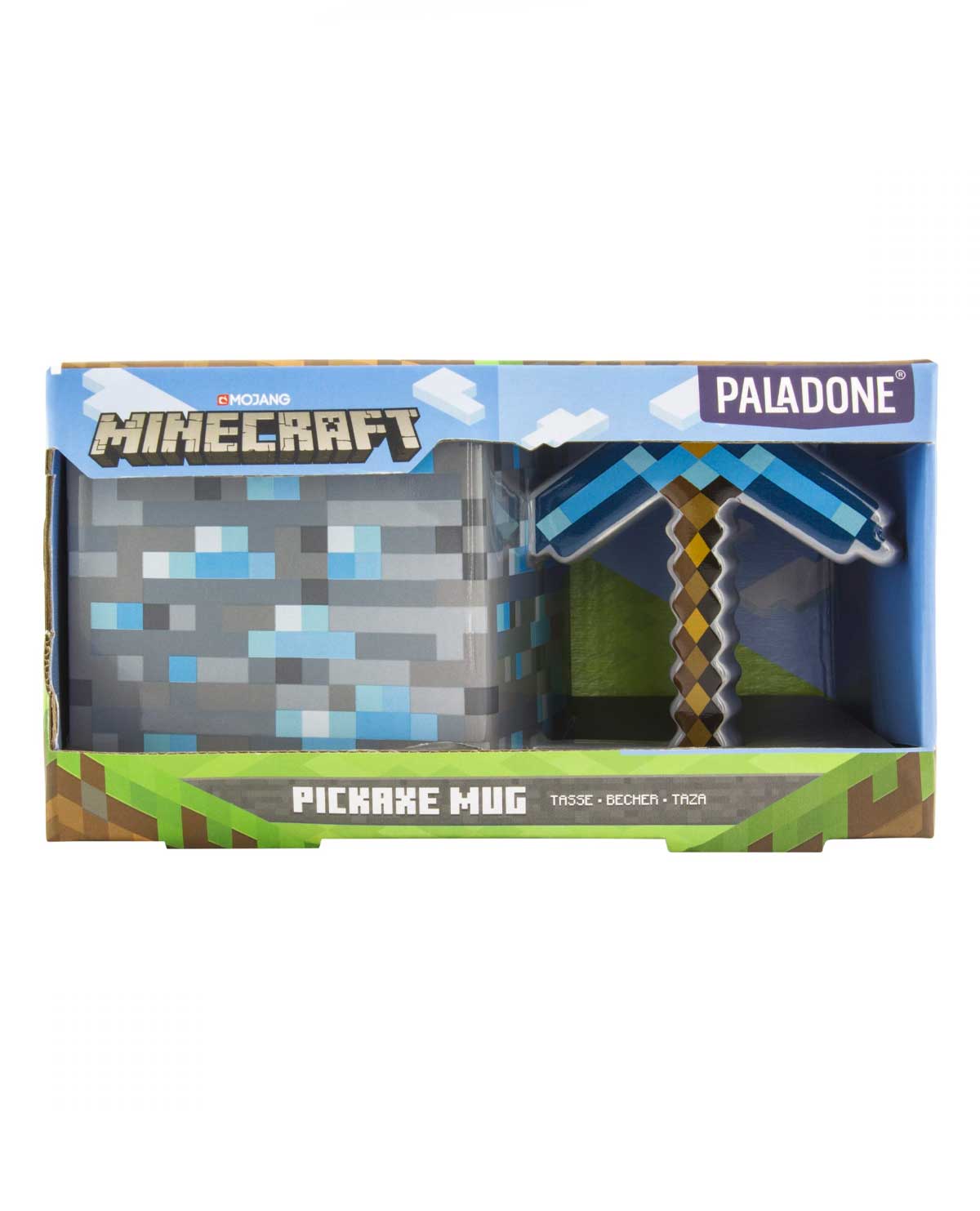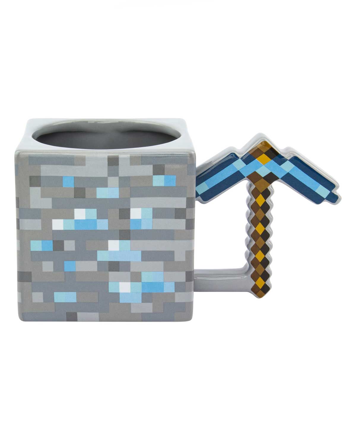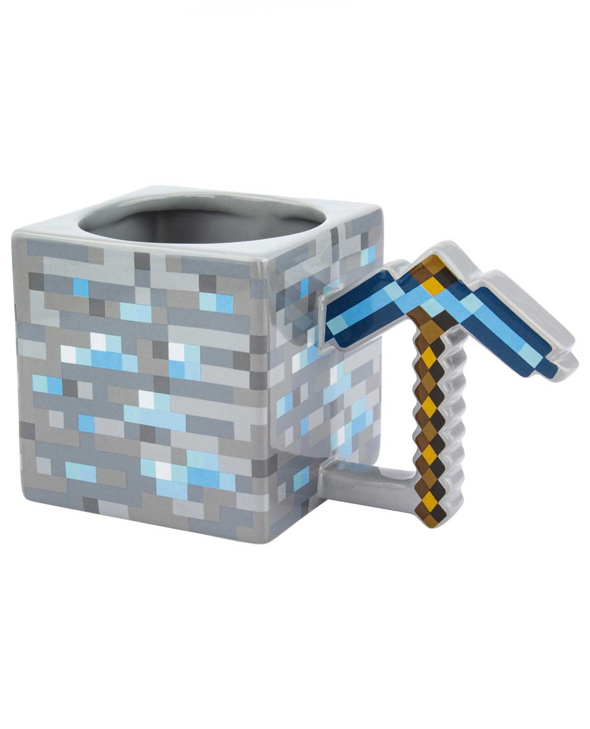 Esta taza cuadrada de gran tamaño con licencia oficial de Minecraft tiene un mango único en forma de pico de diamante como se muestra en el juego. Se requieren diferentes calidades de pico para cosechar con éxito ciertos minerales y bloques.