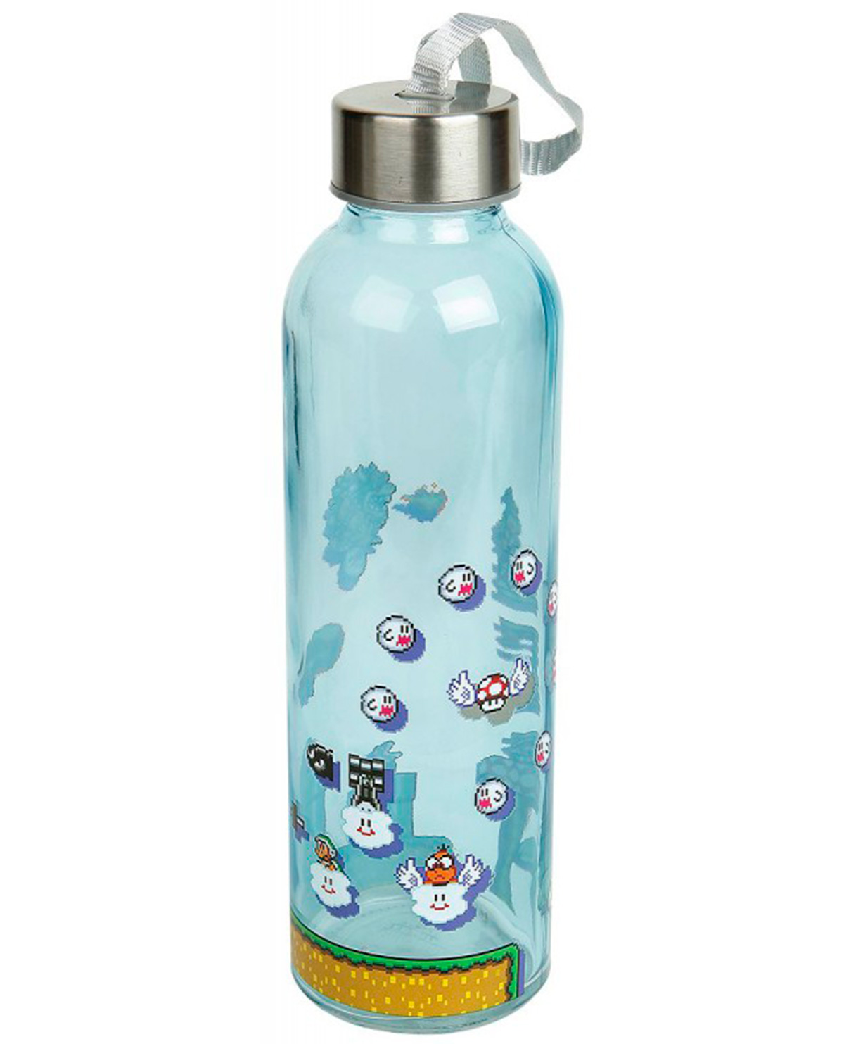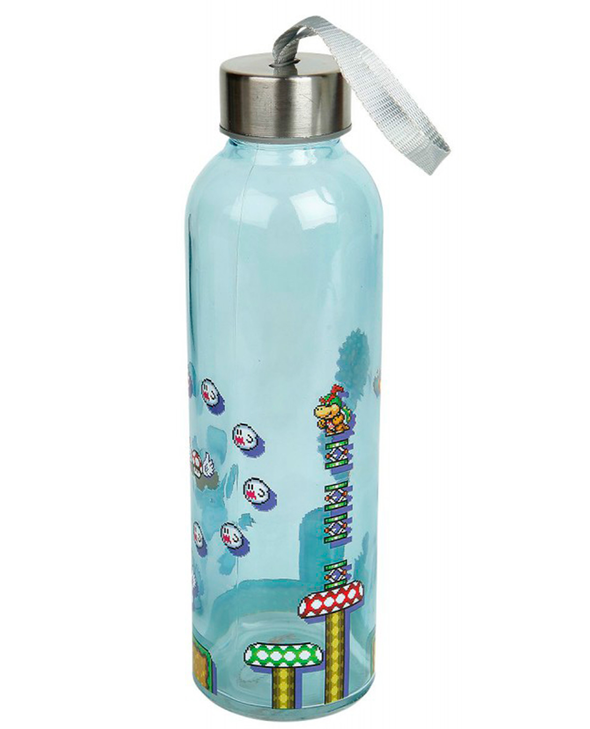 Se trata de una botella de gran calidad, fabricada en una combinación de cristal y acero inoxidable muy acertada, con un sistema de cierre perfecto para el uso cotidiano. Pero lo mejor su genial diseño, que reproduce una pantalla de este famoso juego de plataformas, conservando el genuino pixel original, y donde aparecen varios personajes míticos del universo Super Mario.