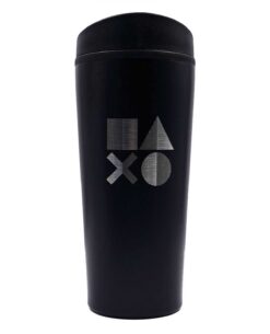 Lleva contigo tu café a todos lados en este termo negro matte de acero inoxidable con detalles grabados que muestran tu lado gamer.