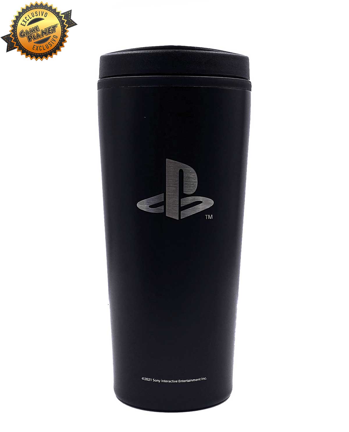Lleva contigo tu café a todos lados en este termo negro matte de acero inoxidable con detalles grabados que muestran tu lado gamer.