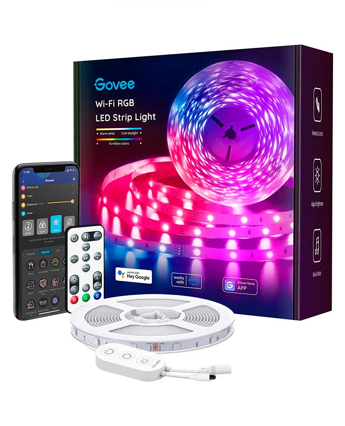 Múltiples opciones de control y escena: Opera fácilmente tus tiras de luces LED inteligentes con la aplicación Govee Home, control remoto o caja de control. La aplicación Govee Home te da acceso a más de 16 millones de colores, 64 modos de escena y una gran cantidad de características increíbles.