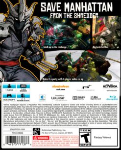 ¡Cowabunga! Las Tortugas ninja están de regreso. El nuevo juego de nuestras tortugas mutantes ahora para PS4. Combate a los villanos en Manhattan en modo cooperativo para 4 jugadores online, o disfruta el modo de un jugador controlando a nuestras 4 tortugas con sus habilidades únicas. Viejos enemigos hacen de las suyas en la ciudad y es tú deber protegerla. Controla a Leonardo, Donatello, Michelangelo y Raphael, explora la ciudad desde la sombras y brinca por los edificios.