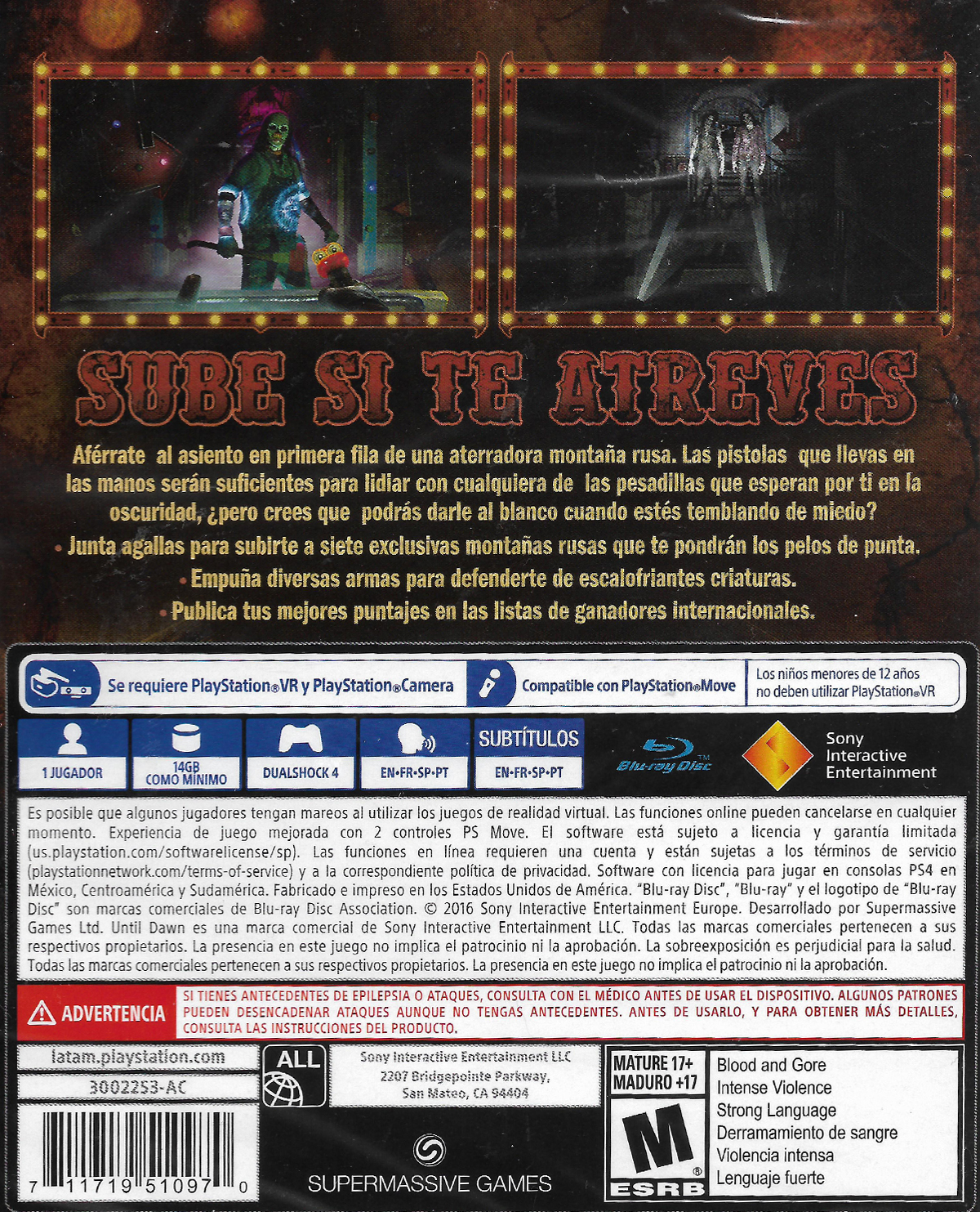 Átate a la silla para vivir la experiencia más perturbadora que jamás hayas vivido. De las provocativas mentes del equipo de Until Dawn, el clásico juego de terror para PS4, llega Until Dawn: Rush of Blood, una experiencia de realidad virtual que despliega terror en el corazón de cada feliz fanático de este juego de arcade.